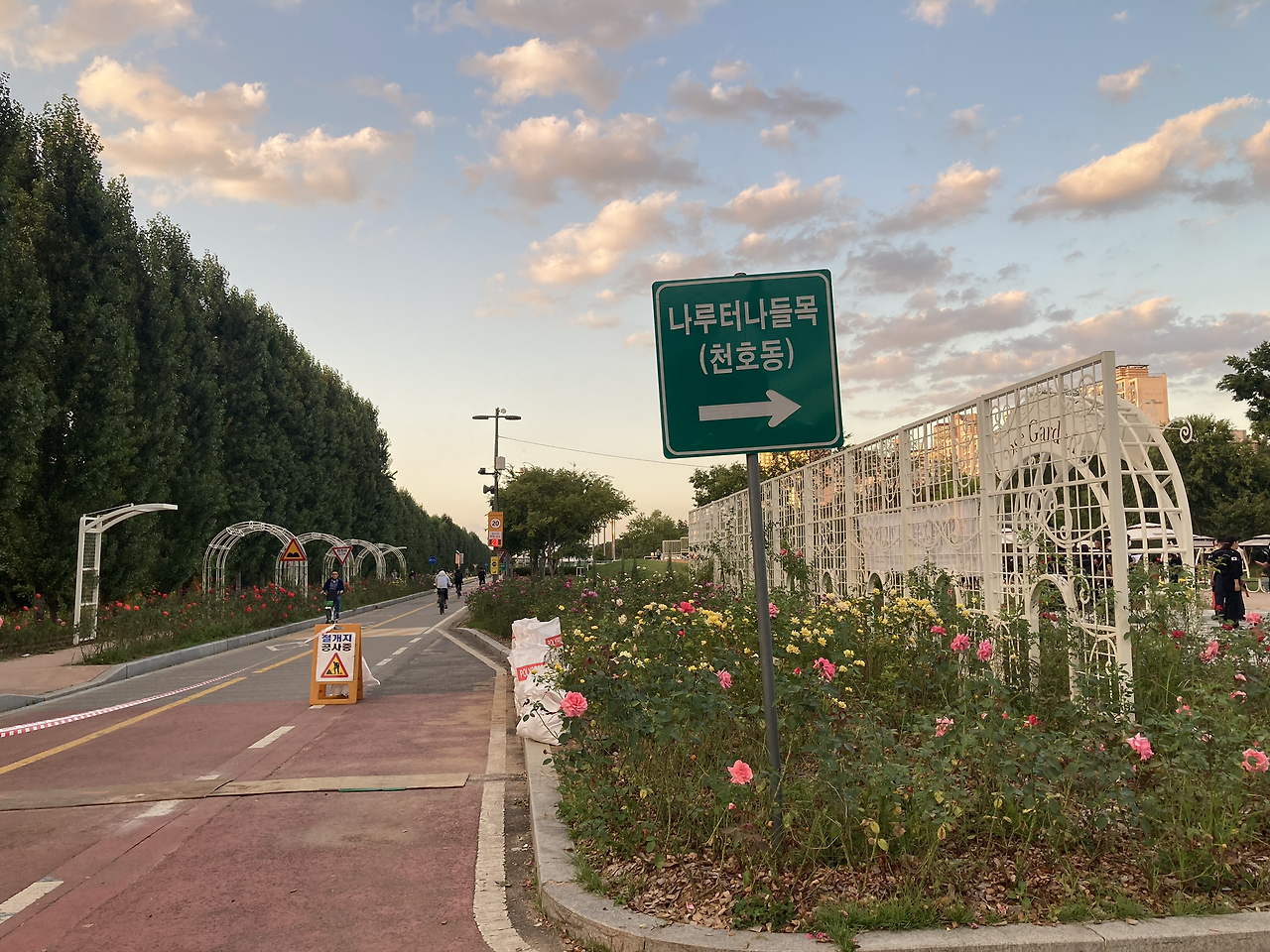 마침내 친구와 만났다. 샌드위치 가게에서. 이 곳 샌드위치는 정성이 있었다. 친구가 가자고 했던 이 곳, 간판도 잘 보이지 않아 언뜻보면 여기 맞나 싶은 곳이었지만, 샌드위치에 만족하여 다음에 다시 들러보고 싶었다. 따뜻한 것과 차가운 것 두가지 샌드위치를 따릉이 바구니에 넣고, 퇴근하며 지나가는 길에 봐두었던 그 근처를 가자고 했다. 원래는 좀더 달린 후에 한강을 바라보며 먹고 싶었지만, 배가 너무 고픈 나머지 가장 가까운 식탁형 벤치에 가자고 했다. 따릉이를 타고 천호 나들목을 지나자마자, '저기야.'를 외치고 곧바로 멈췄다. 친구는 식탁이 있는 벤치를 보며 감탄했다.