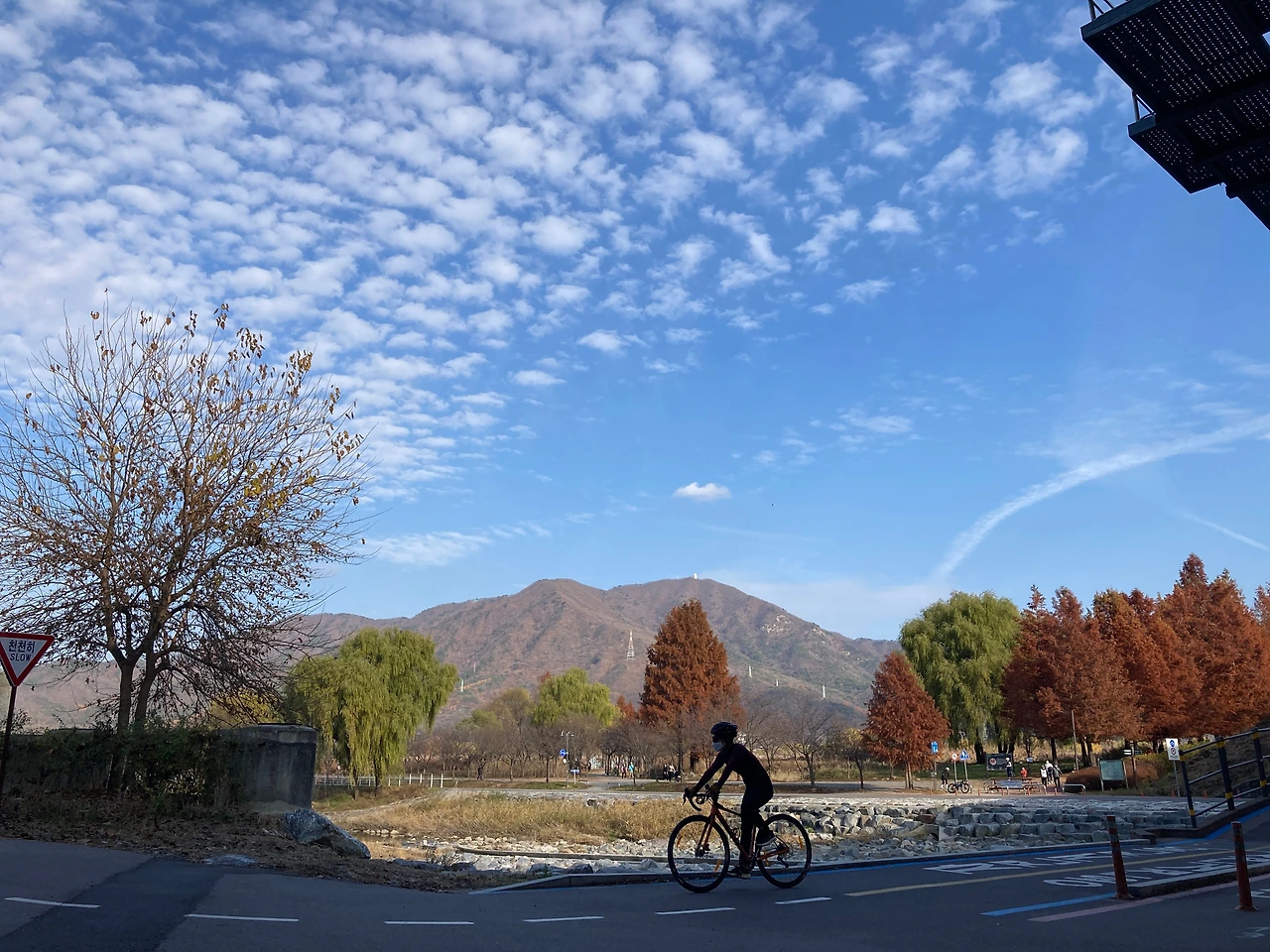 이렇게 좋은 날, 이 하늘을 함께 바라보았다. 여기가 주말 라이딩의 끝이었다. 땀을 꽤 흘린 뒤 앉아서 나눴던 이야기가 지금은 기억나지 않지만 처음으로 같이 한 이 라이딩풍경이 기억에 남는다.