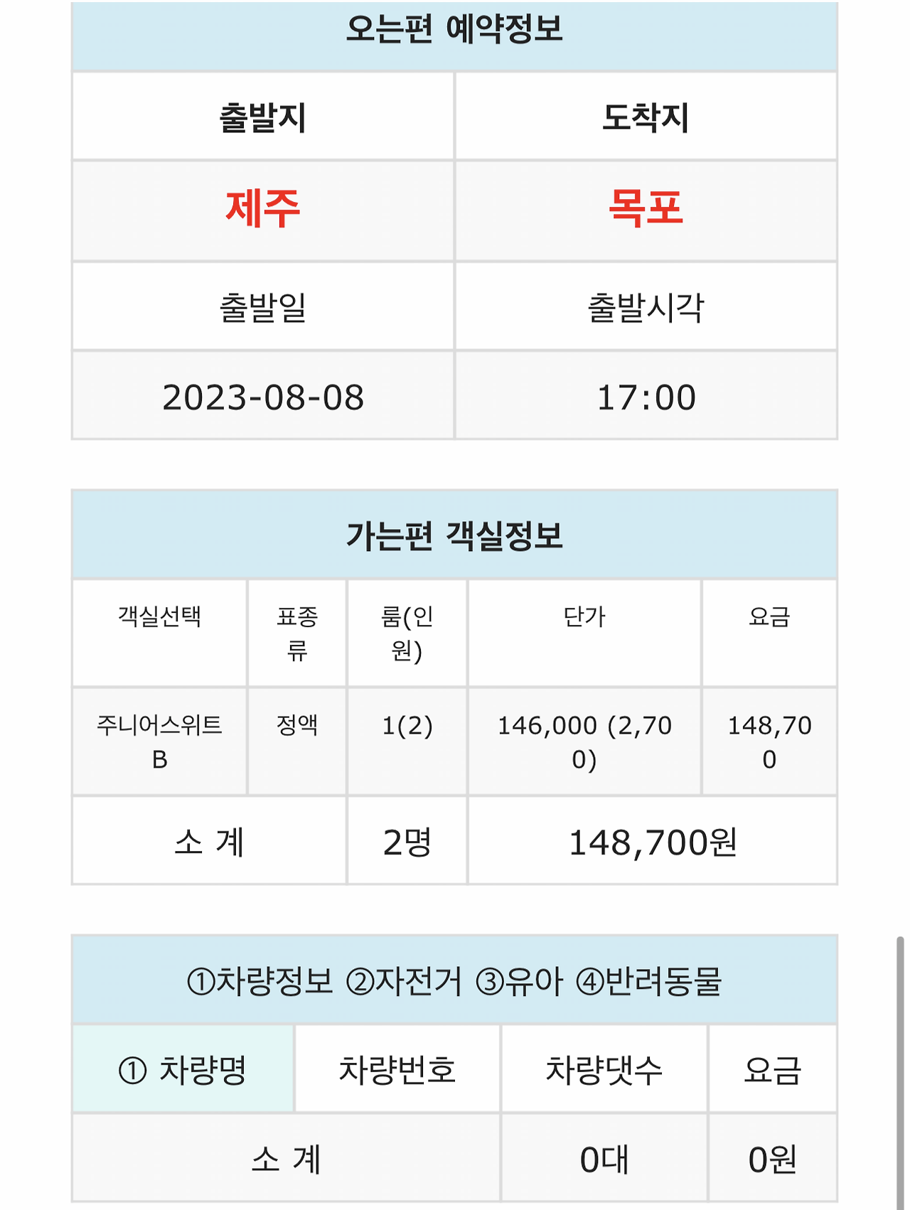 동생에게 배로 예약했다고 하면서 덧붙인 말. 동생은 그러자고 했다. 목포에서 새벽 1시에 출발하는 실버클라우드호는 밤 10시부터 승선도 가능하다. 그러니 목포까지 오느라 쌓인 피로를 잊을 수 있게 침대칸에서 일찍 잠들면 되었다. 동생과 나는 다인실 침대로 예약했다. 2일 뒤에 제주도에서 오후 5시에 오는 퀸메리호에는 2인실 주니어 스위트 자리가 많이 남아 있는데 일요일에 출발하는 실버클라우드호에는 다인실 자리와 이코노미 다인실 자리만 있었다. 두 개의 가격 차이는 얼마 안 나기 때문에 2인실 주니어 스위트 빈 자리가 나기만을 기다렸는데… 없었다.