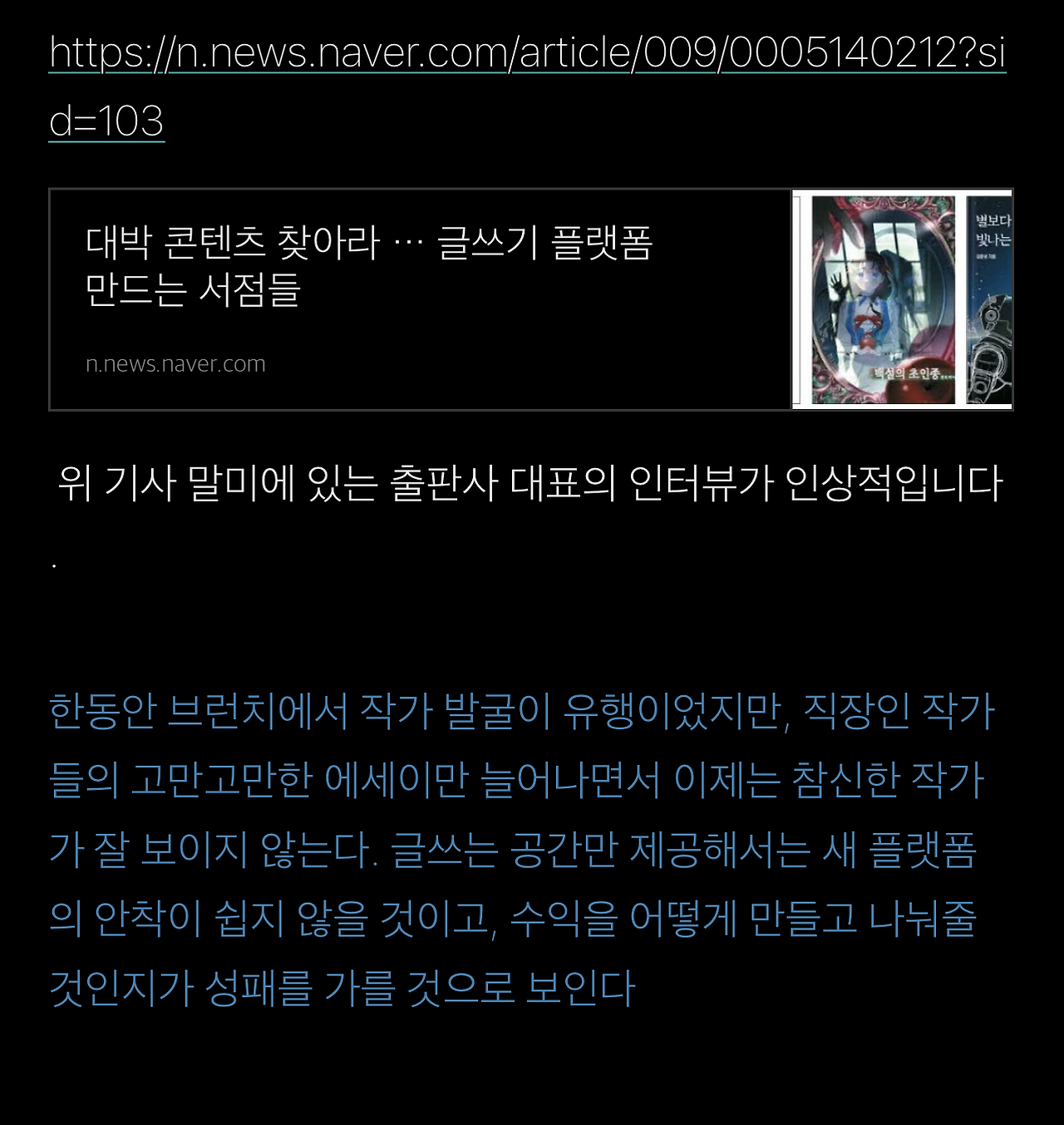 그중 한분 작가님이 쓴 글에는 출판업계인사의 말을 인용한 기사가 있었다. 과거 브런치의 기능과 최근 브런치 작가들에 대한 평을 했는데, 그 문장을 읽고 말았다.