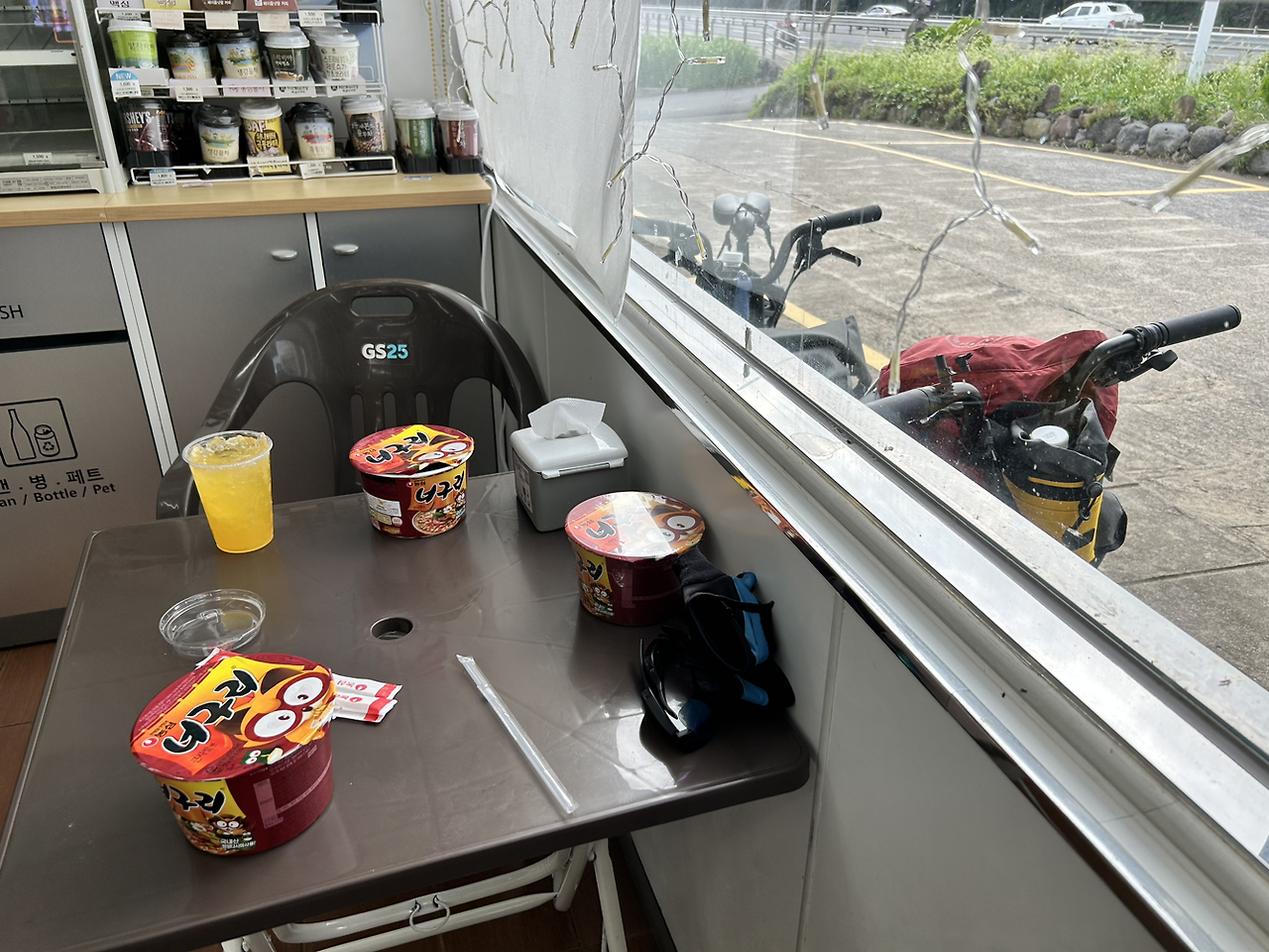 탄수화물인 컵라면으로 배를 채우고, 땀으로 날아간 수분 보충을 위해 음료수를 벌컥벌컥 들이켰다. 평상시 컵라면을 먹을 일이 거의 없어서 즐기지 않았는데, 식당도 없고, 먹을 것이 마땅치 않아서 기력보충을 위해 컵라면과 오렌지주스 얼음컵을 샀다. 컵라면이 이렇게 맛있는 거였구나, 다시 한번 감사의 마음을 전하며 이러한 시스템이 있는 자전거길 덕분에 우리가 이렇게 달릴 수 있는 거라며 마음의 인사를 편의점 직원에게 하면서 나갔다. 편의점에 들어갈 때 장갑과 고글, 헬맷을 벗을 때의 그 시원함과 기력보충을 한다는 기쁨, 이제 다시 달려볼까 하며 다시 착용할 때의 긴장감과 또다시 달릴 기대감이 좋았다. 이러한 사소한 감정들조차 자전거를 탈 때의 기분좋은 경험이 된다.