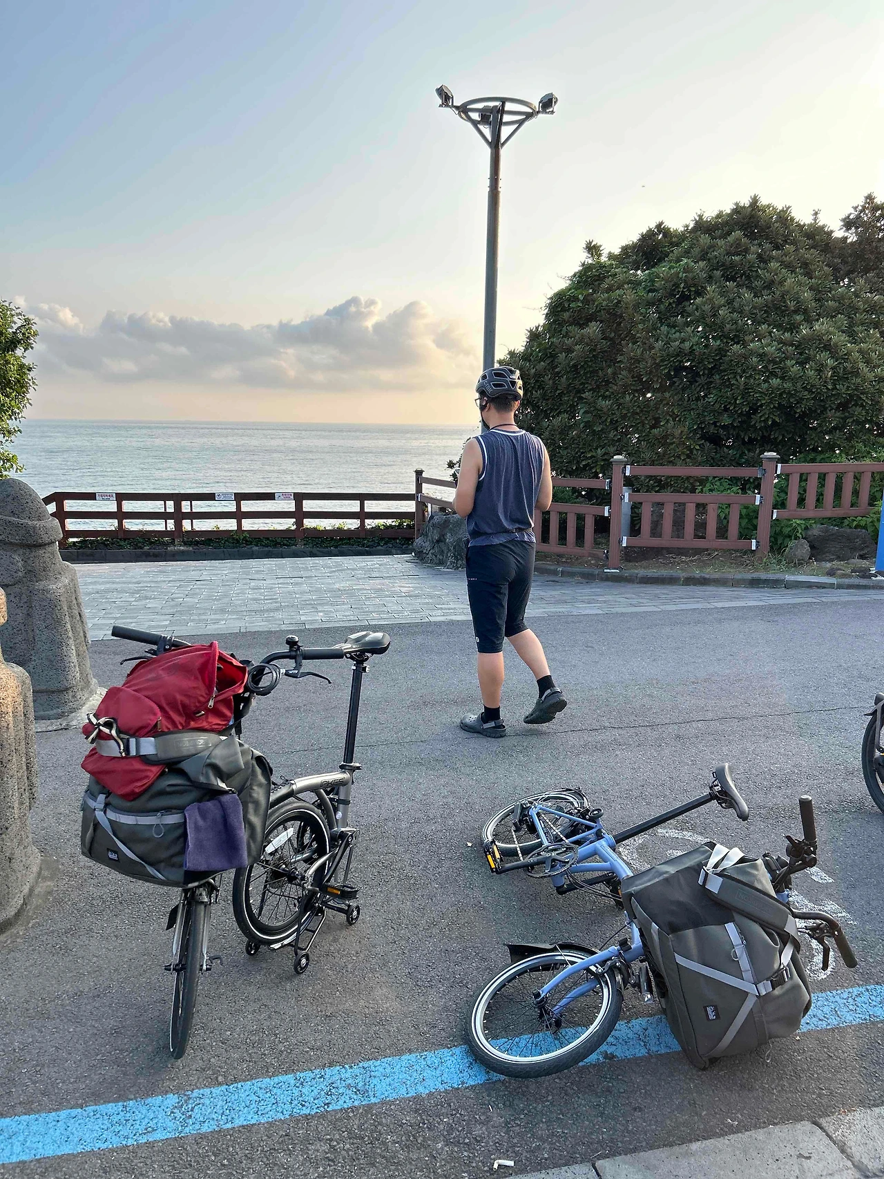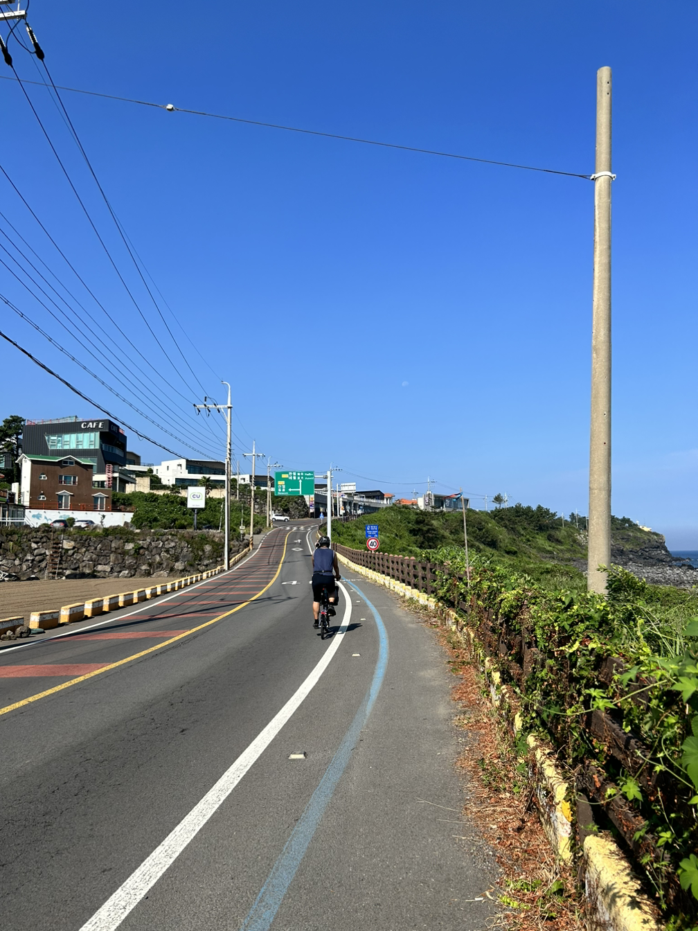 이렇게 물도 많이 마시고, 카페도 몇 차례 들르면서 제주도 해안을 80킬로미터 달렸다. 모슬포항 근처까지 갔다. 60킬로미터에서 멈췄으면 가장 좋은 컨디션을 유지했을 텐데 동생은 그 이후 통증을 호소했다. 나는 70킬로미터까지는 통증이 없었지만 그 이후 약간 느껴졌다.