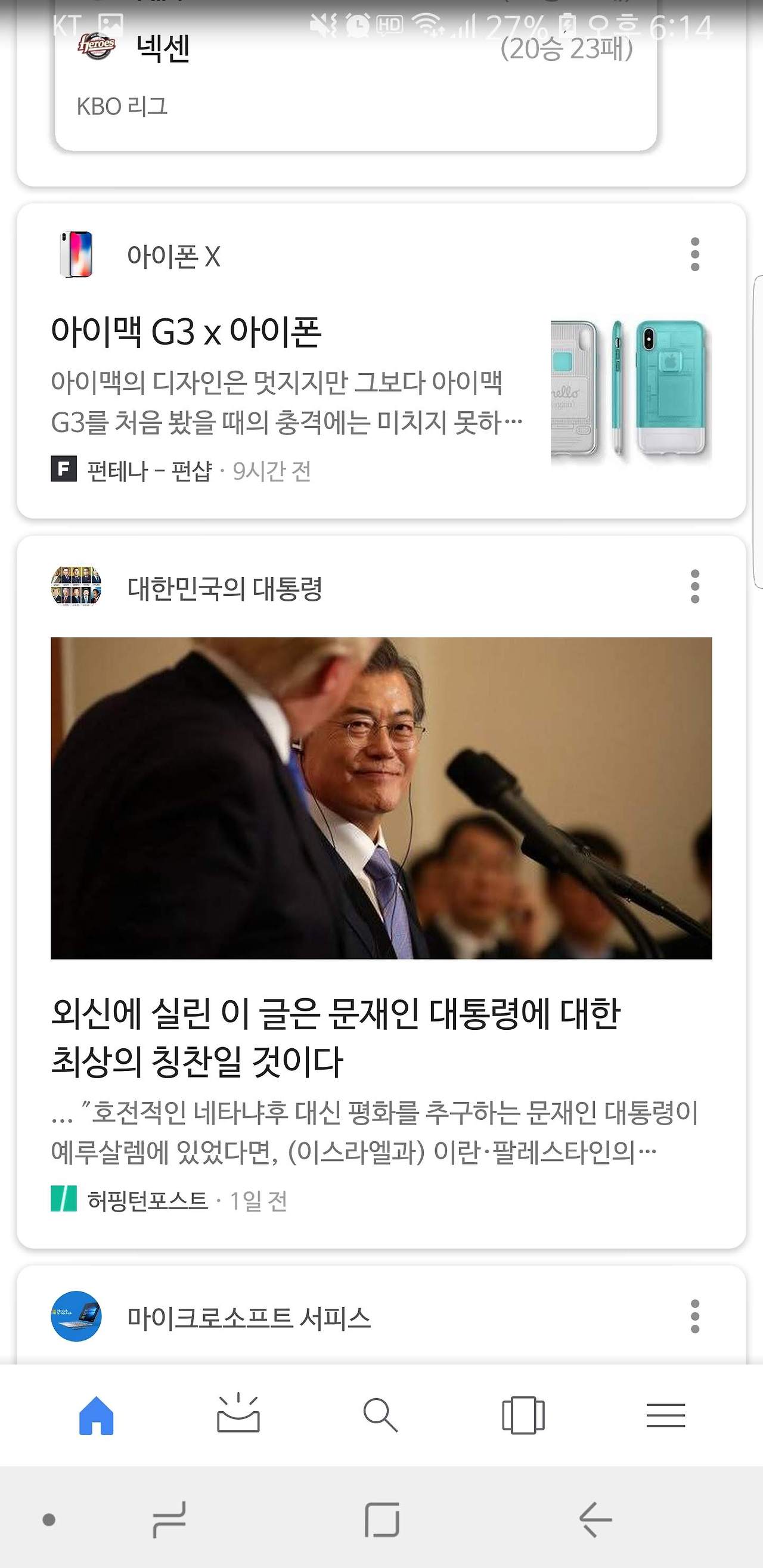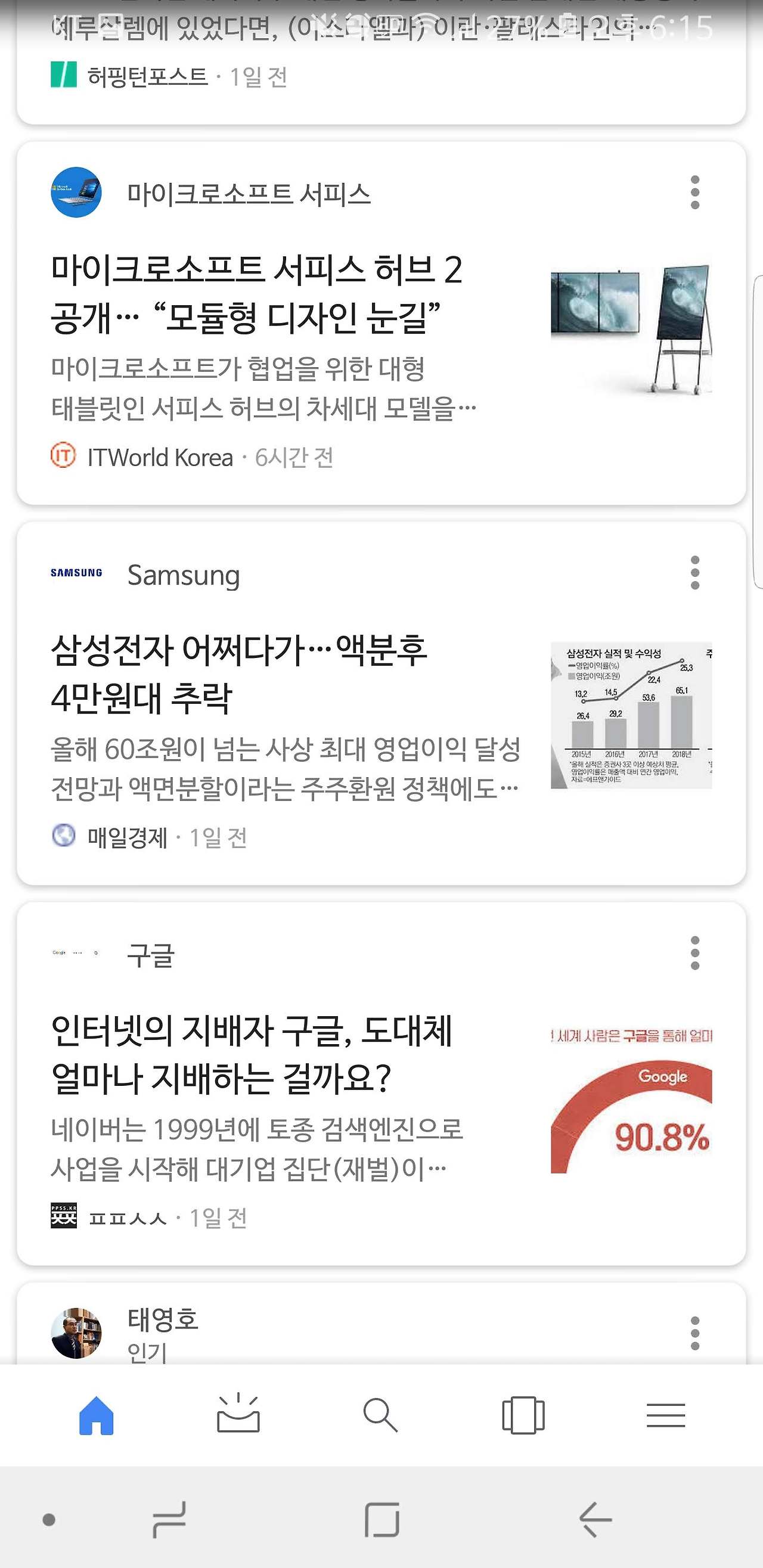첫 번째 판인 가칭 '홈판' 혹은 '검색판'은 "모바일 첫 화면에서 뉴스를 제외하고, 검색 중심으로 화면을 재편하겠다"라며 "모바일 첫 화면을 재구성함으로써, 몇 개의 뉴스와 검색어에 집중됐던 관심을 분산시키고 사용자가 선택한 기능과 컨텐츠를 쉽게 소비할 수 있는 구조로 변화해 가겠다"라고 말했다. 어떤 방식이 될지는 알 수 없지만 추측해보건대 현재 구글 앱 서비스에서 제공하는 형태와 유사하지 않을까 짐작해본다. 구글 앱 서비스에서는 처음에 검색 창을 제공하고 이하로는 사용자 맞춤 컨텐츠 피드로 구성된다. 내 경우엔 이런 콘텐츠들이 죽 늘어져 있다. 이와 비슷한 와중에 네이버 서비스들을 사용자 개인에 맞게 적절하게 추천하는 방식이 가장 현실성 있지 않을까 생각한다.
