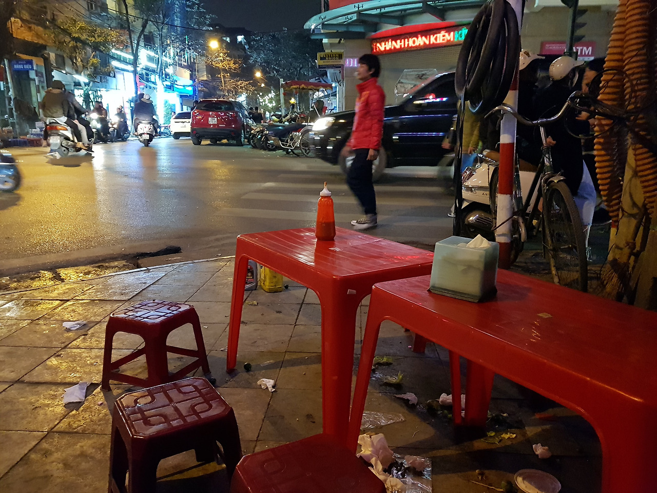 하노이에서 만났던 대부분의 가게는 그 앞 인도까지 영역을 뻗고 있다. 내가 찾아갔던 쌀국수 집은 교차로 길 모퉁이에 위치했는데, 그 모퉁이에 둥그렇게 테이블을 배치해두고 장사를 하고 있었다. 길거리에서 만날 수 있는 식당이 대체로 이렇게 장사한다. 좀 더 돌아다녀 보니 알겠더라. 건물 공간은 최소로 요리할 공간만 갖추고 있고, 손님이 앉는 자리는 근처 인도를 활용한다. 겹쳐서 놓을 수 있어 공간 활용이 좋은 플라스틱 테이블과 의자를 쓴다. 가게 앞 인도는 가게 땅에 테이프로 단단히 엮여 있는 플러스 상품이다. 소규모로 장사하시는 분들은 아예 공간도 없이 길거리 한쪽에서 요리할 수 있게 세팅을 해 두고 요리를 굽고 튀기며 손님을 받기도 한다.