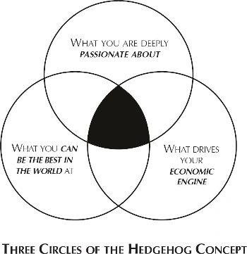 위대한 기업과 다른 기업의 본질적인 전략적 차이는 두개의 근본적인 차이에 있다. 첫째, 위대한 기업은 세 개의 원이라는 불리는 것에 대한 깊은 이해에서 오는 그들의 전략을 찾은 것이다. 둘째, 위대한 기업은 그들이 이해한 것을 단순한 결정형 개념으로 해석한 것이다. 그것이 고슴도치 이론이다.
