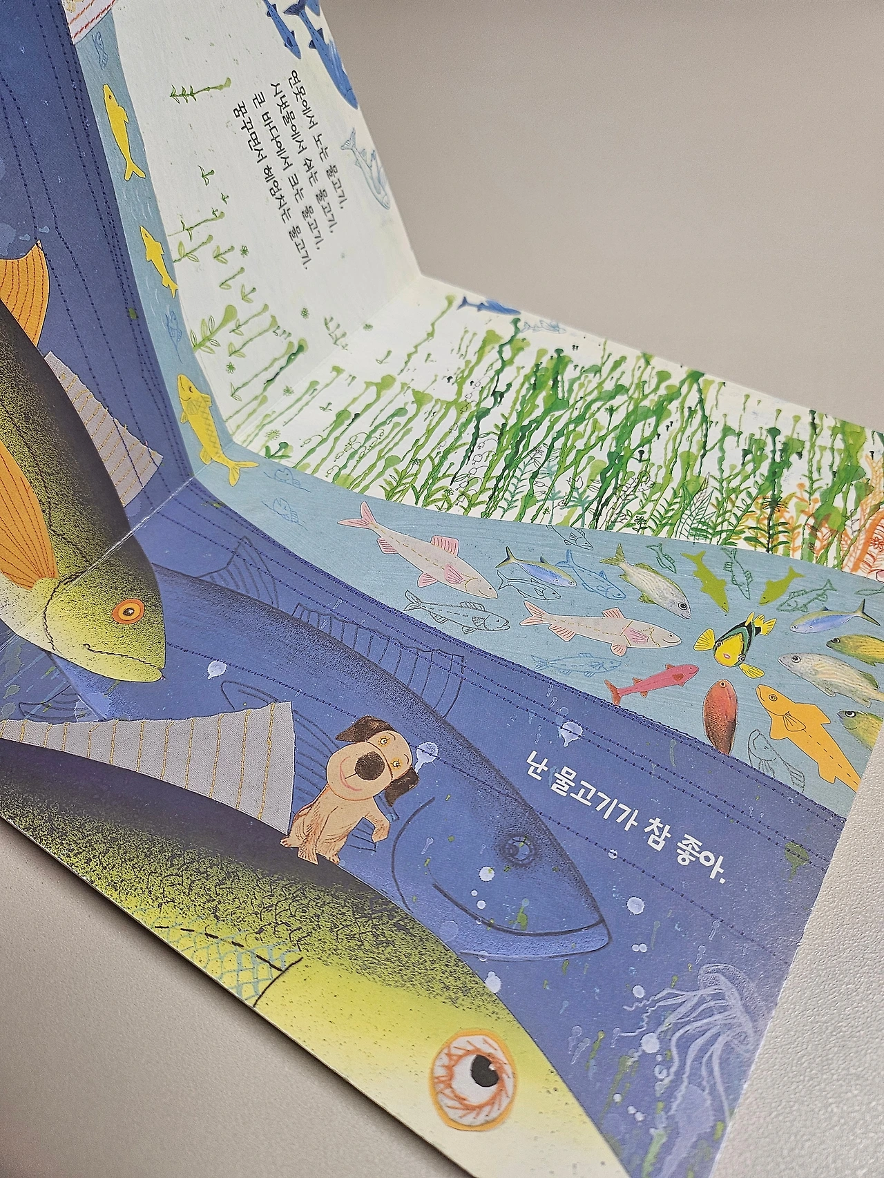 씨앗에서 물고기로 시선이 옮겨갑니다. 세상에는 요런조런 물고기가 있네요. 아기 물고기가 있으면 할아버지 물고기도 있고요, 연못에서 노는 물고기가 있다면 꿈꾸면서 헤엄치는 물고기도 있습니다.