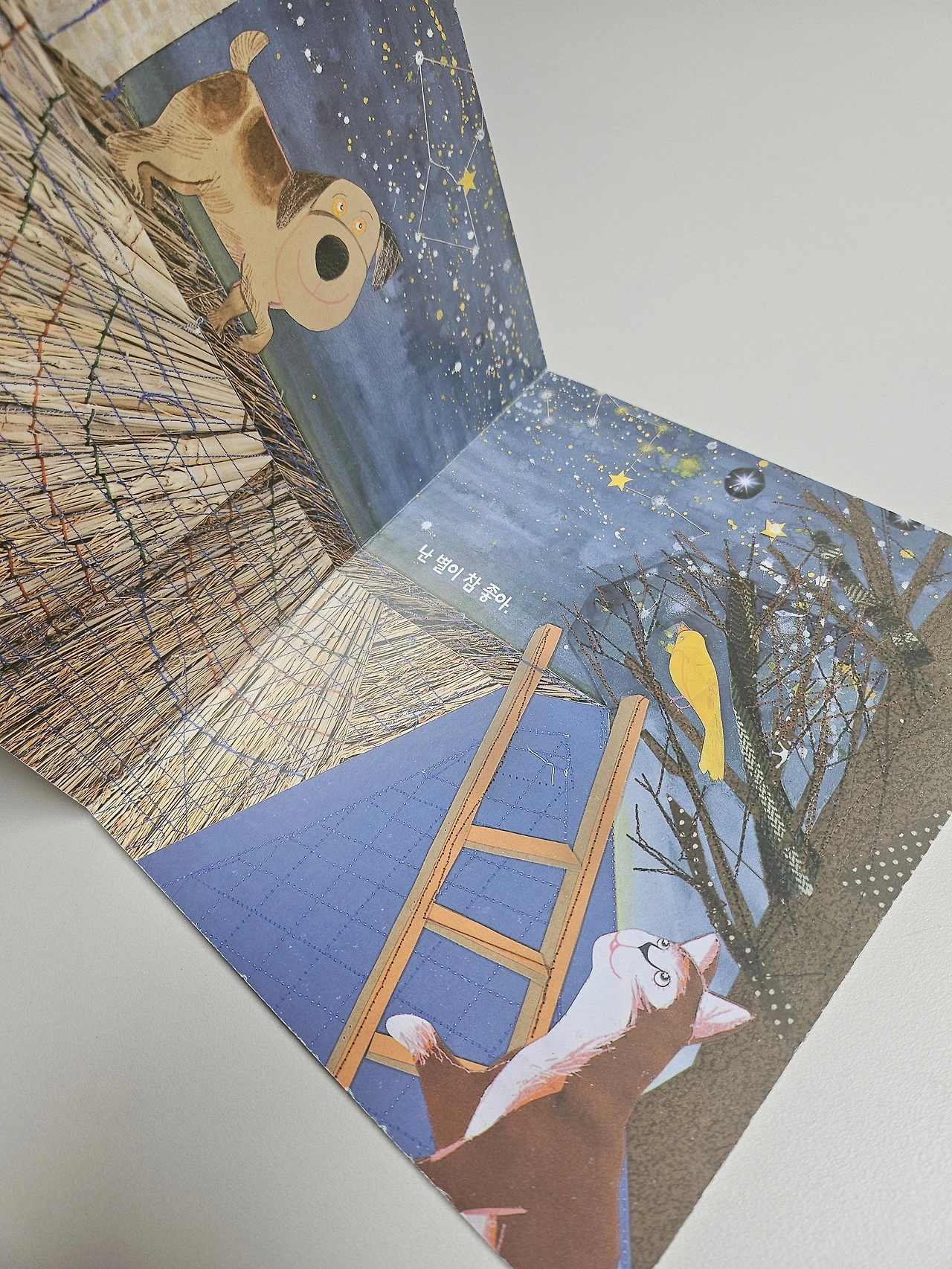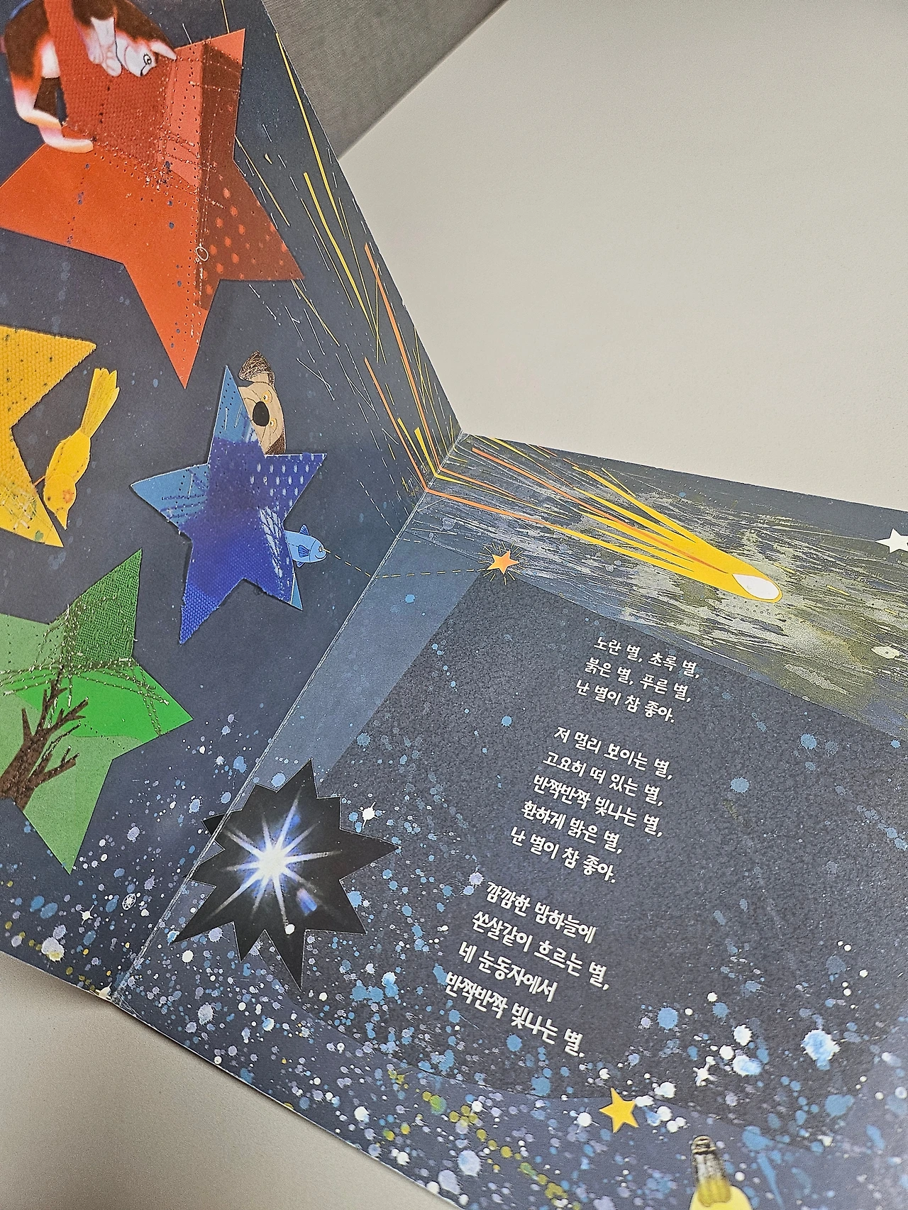 아름답고 따뜻한 그의 시에 한국 작가의 그림을 입힌 작품, <난 별이 참 좋아>입니다. 섬유 미술학을 전공한 박해남 작가는 옷감, 실 등을 오리고 붙이는 콜라주로 글의 느낌을 잘 표현했습니다.