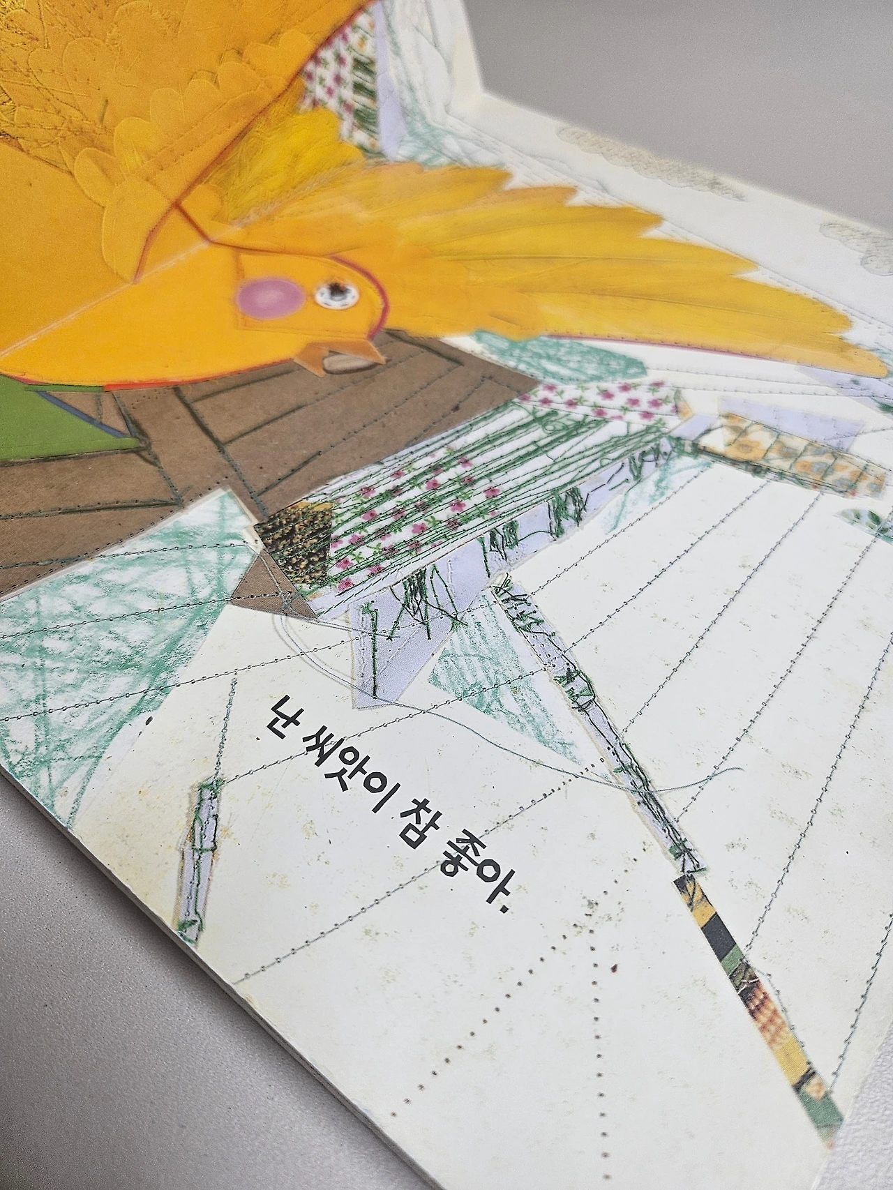 "난 씨앗이 참 좋아"라고 엄마가 읽어주면 옆에 있던 아이가 손가락으로 새가 물고 있는 씨앗을 가리키며 '씨앗'을 알아보았다고 하는 모습이 연상되는 첫 장입니다.