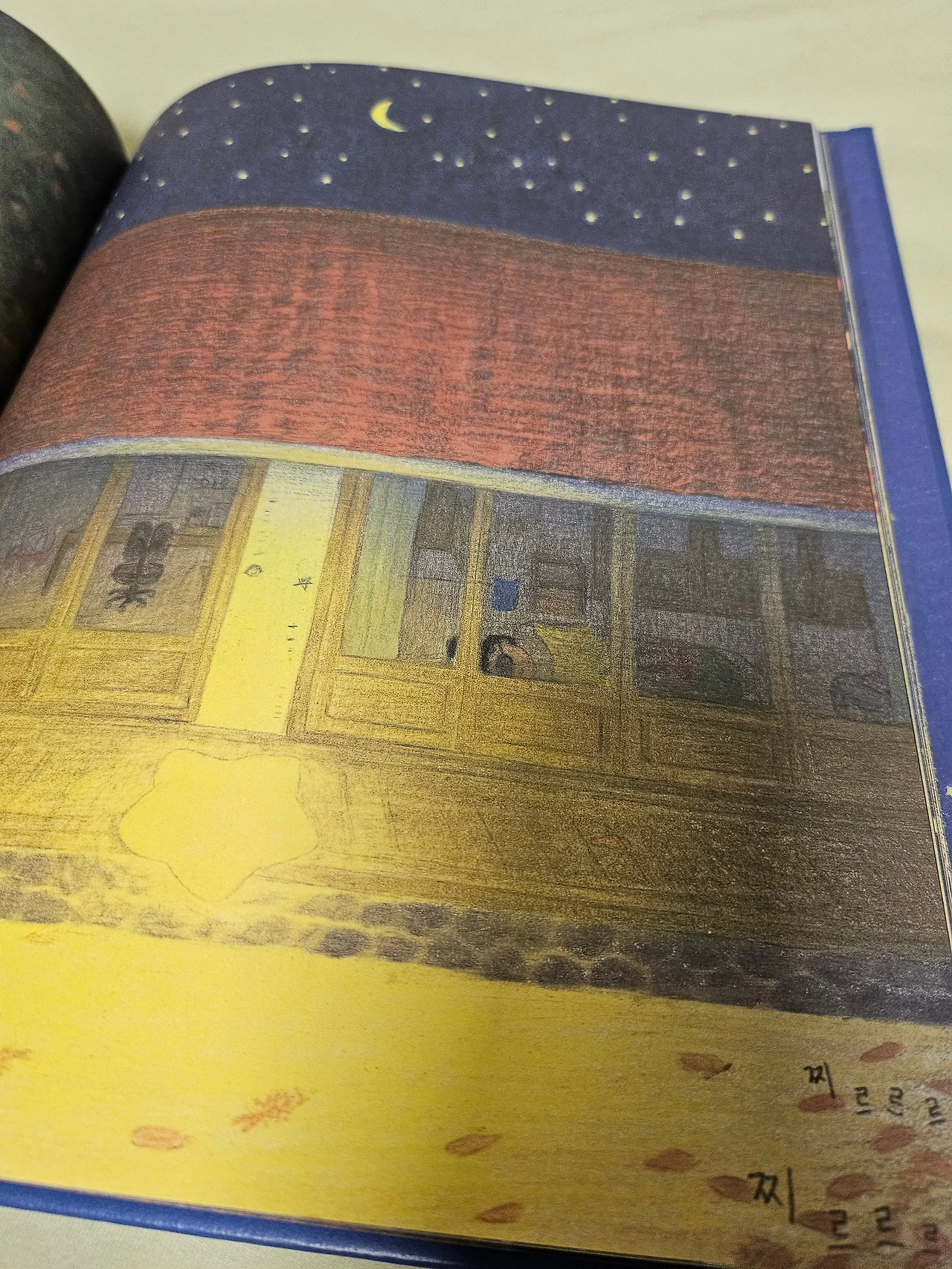 마치 달빛을 쬐고 있는 듯 마루에 놓여 있는 별이 보입니다. 달에게 받은 빛으로 아이와 엄마가 있는 집을 환하고 따뜻하게 해주는 것처럼 느껴지기도 합니다. 안녕달의 그림책에는 늘 안녕달표 온기가 습니다.
