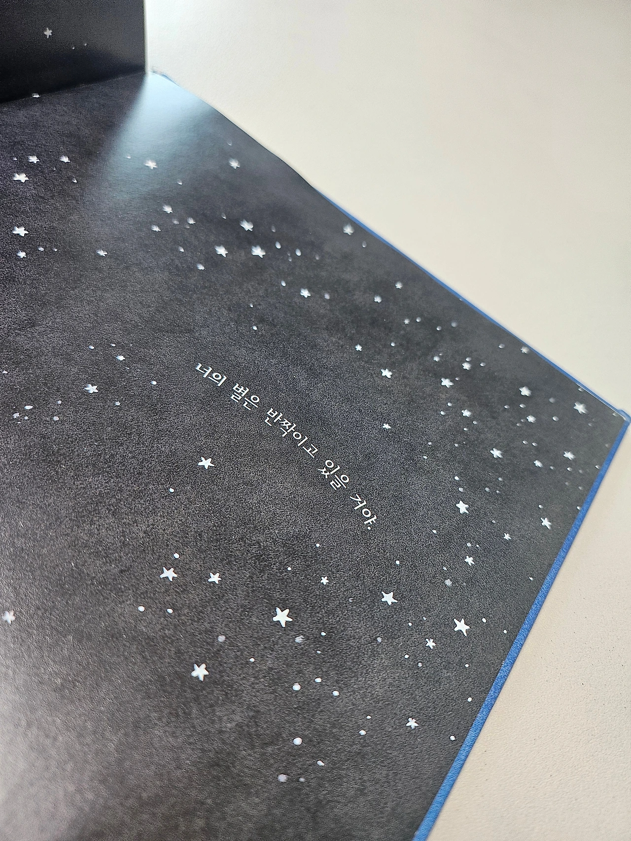 작가는 별이 보이지 않을 때도 별은 항상 있다고 언제나, 어디서나 너의 별은 반짝이고 있을 거라고 속삭인다. 세상에 많은 별이 있지만 그중 너라는 별도 늘 반짝이고 있다고 말해주고 싶었던 것 같다.
