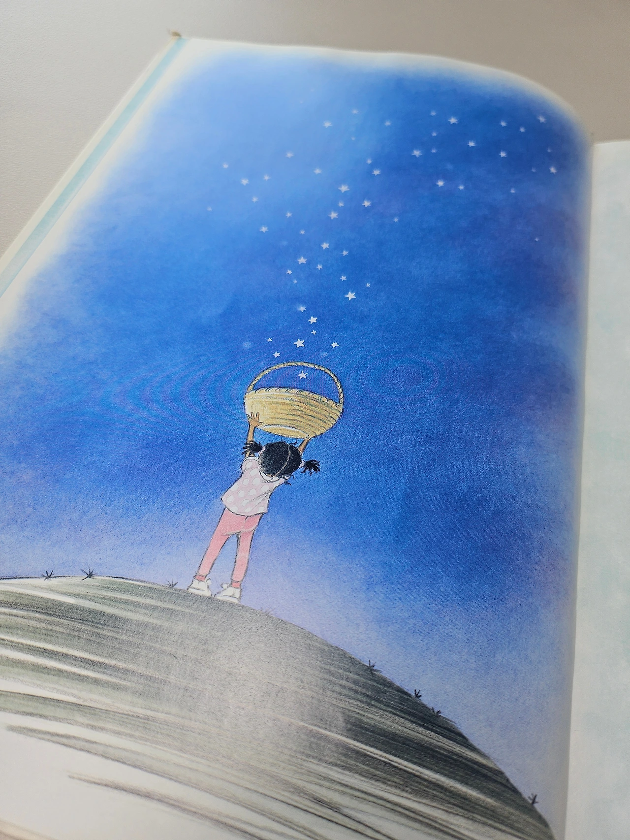 그리고 그림책 표지 그림 장면이 나온다. 별을 바구니에 담고 싶은 마음, 담으면 은 달걀처럼 반짝반짝 빛날 거라고 생각하는 상상이 모두 담겨있다.