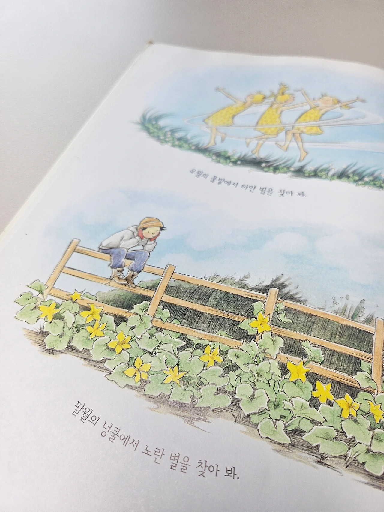 유월의 풀밭의 하얀 별은 칠월에 빨간 딸기가 되고 팔월 넝쿨의 노란 별은 시월엔 호박이 될 거란다. 겨울에는 눈꽃 별도 있고 민들레 홀씨를 불면 하늘에 수천 개의 별이 생겨난단다. 그 모든 걸 보고 있으니 나라는 별은 무엇이 될까 궁금해다.