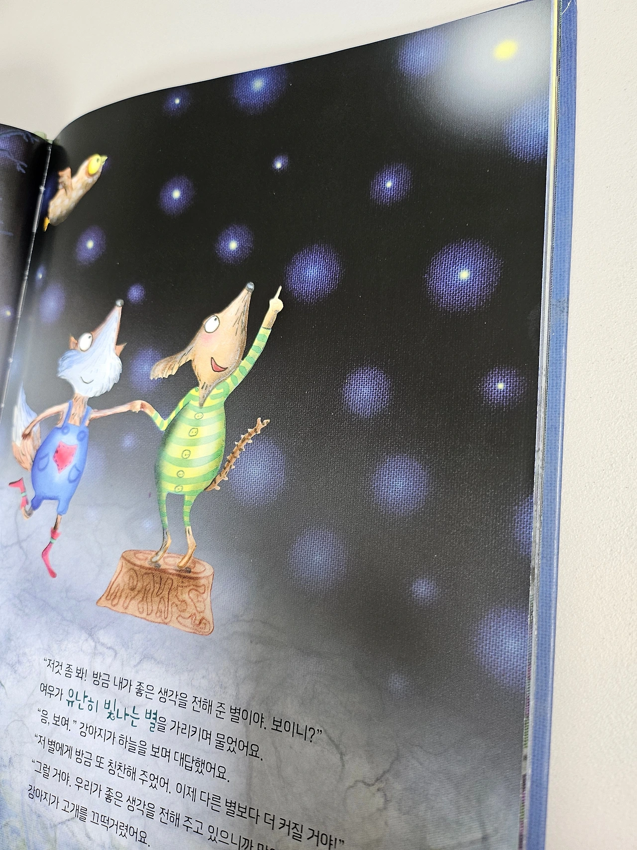 그다음부터 이어지는 여우와 강아지의 대화가 사랑스럽다. 그럼 별이 자라기 위해서는 무엇을 먹어야 하냐고 여우가 궁금해한다. 강아지는 별을 바라보면서 좋은 생각을 하면 별이 자란다고 답한다. 좋은 생각이란 '별아, 오늘따라 반짝이는 게 무척 예쁘구나!' 같은 칭찬이다. 대상을 예쁜 눈으로 바라보란 얘기다.