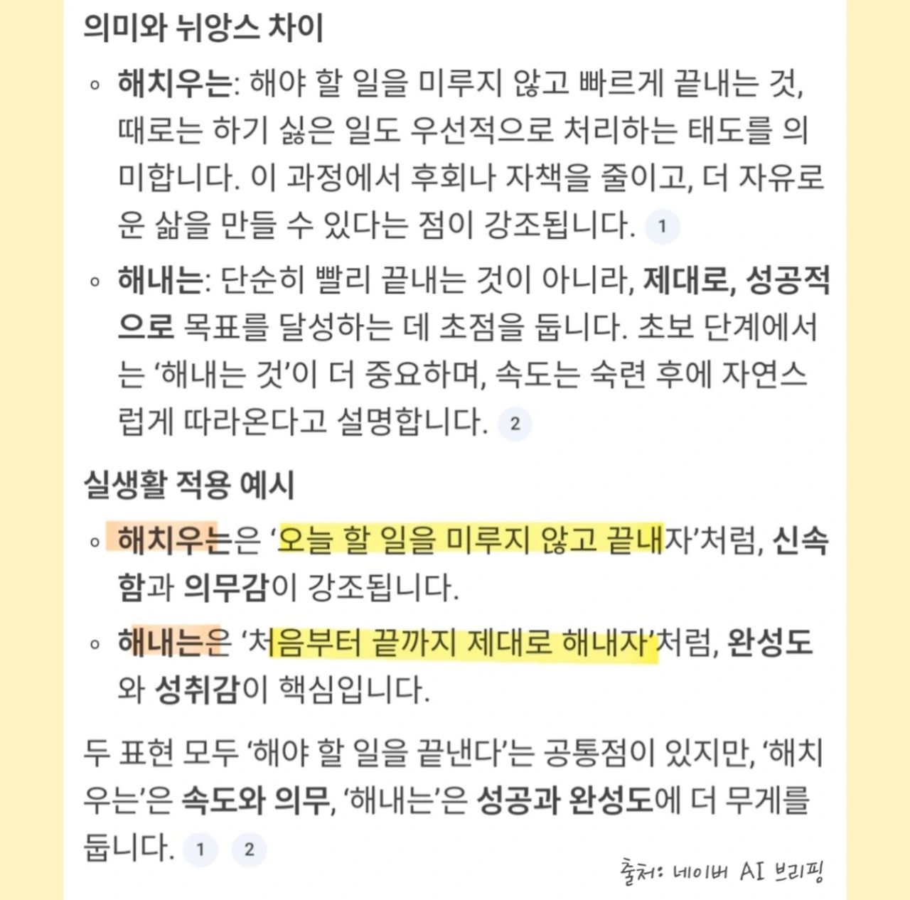 네이버에 '해치우는'과 '해내는'을 썼더니 이렇게 비교해 주었다. 그렇다. '해치우는'은 신속하게, 의무감을 가지고, 제 때 하는 것이다. 그리고 '해내는'은 처음부터 끝까지, 완성도 있게, 제대로 해서, 성취감을 느끼는 것이다. 삶은 대부분 해치워야 하는 일들의 연속이지만 부지런히 해치우다 보면 해내는 순간을 만날 수 있다.