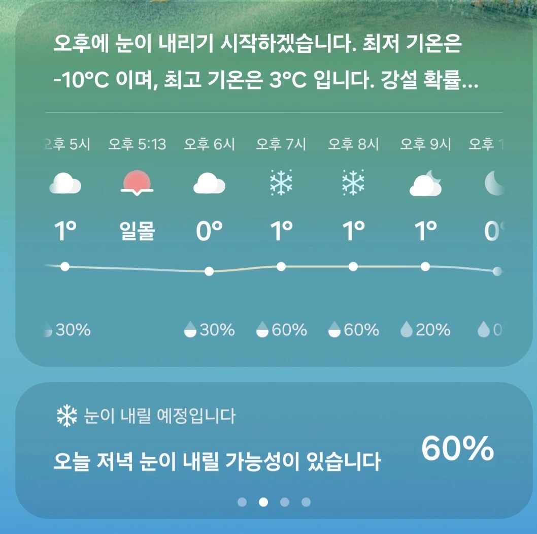 오늘 저녁에 첫눈이 올지 모른단다. 가능성 60%.