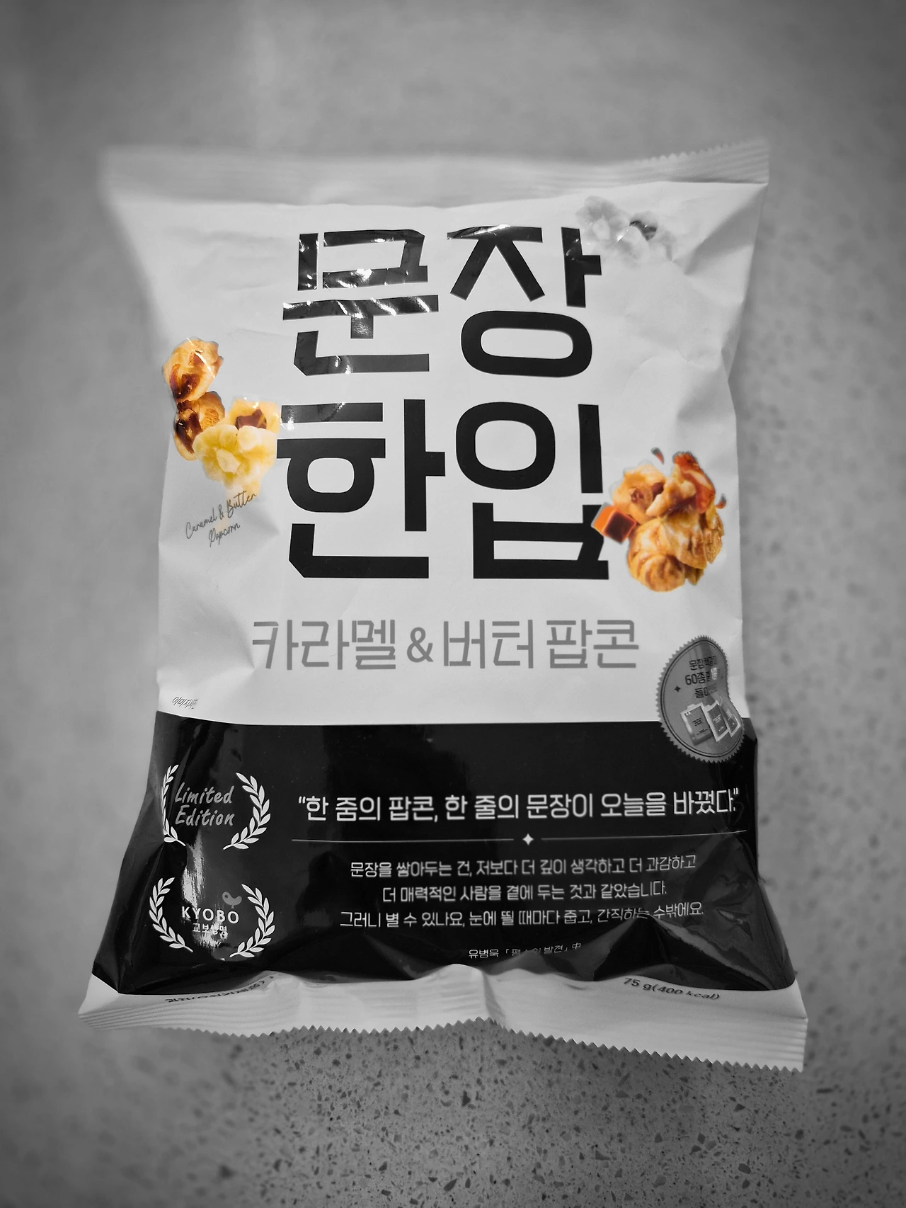 문 장 한 입 책갈피가 들어있다는 팝콘을 샀다. 옥수수 알갱이 같은 내 생각들도 팝콘 같은 맛있는 문장이 되었으면 좋겠다.
