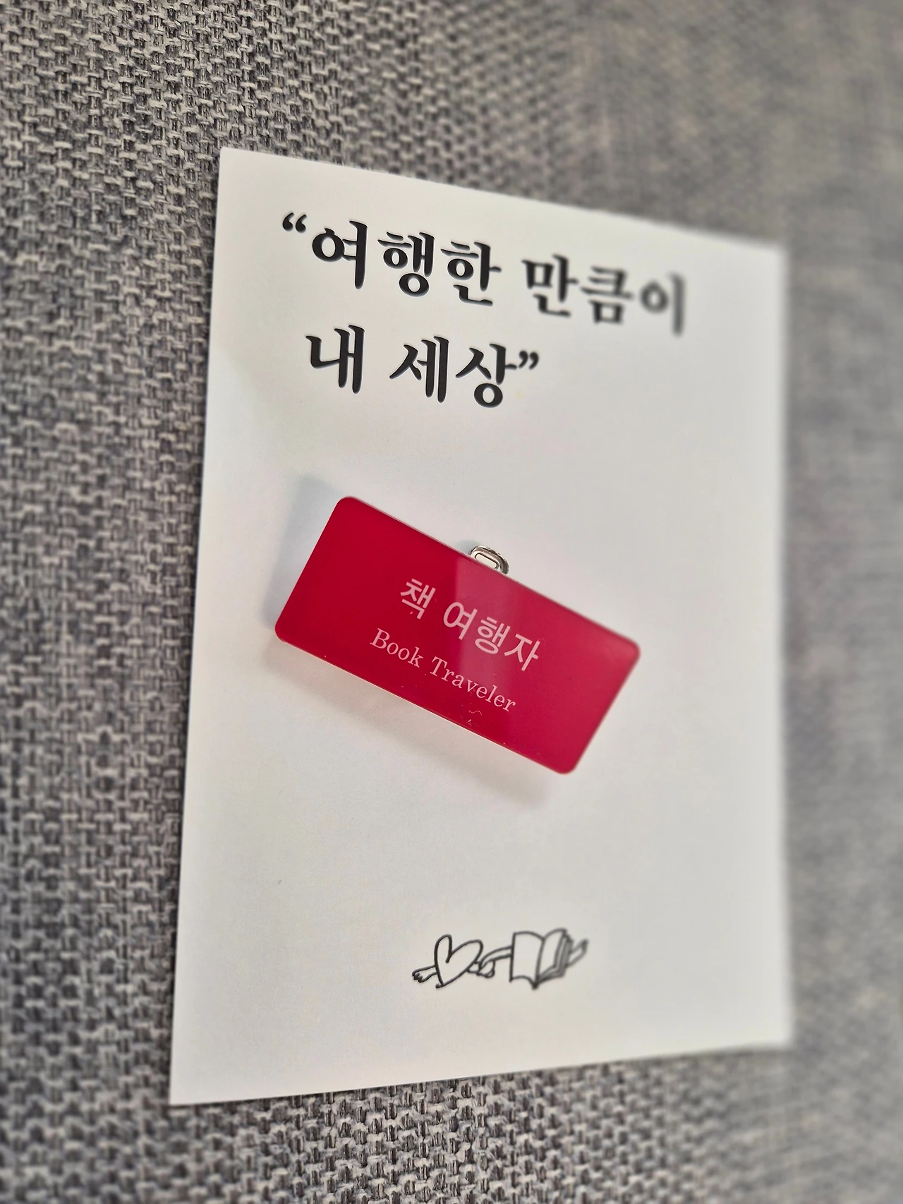 책 사랑 이름표 크리스마스 에디션 <책 여행자>를 샀다. 크리스마스 분위기의 빨간색이 마음에 들었고 <독자> 보다는 <책 여행자>란 이름이 더 근사해서 탐났다. 이름표와 함께 온 엽서의 문구 또한 참 멋지다. 여행한 만큼이 내 세상이라니. 만약 책 읽는 사람 모두가 <책 여행자> 이름표를 달고 있다면 어떨까? 책 여행자를 만나면 반가워서 모르는 사람인데도 말 걸어볼 수 있지 않을까? "어느 책 여행 중이세요? 그 책은 어때요? 저는 OO 책에 와 있는데 정말 좋아요. 한 번 와보시길 추천해요."