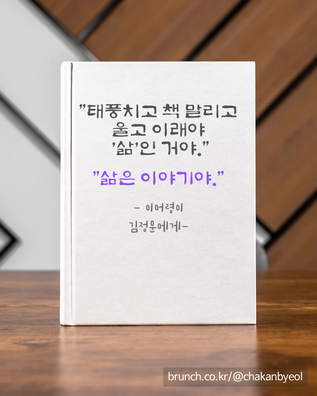 유튜브에서 김정운 박사가 이어령 선생과의 일화를 이야기하는 영상을 보다가 아하! 하고 받아 적었다. 섬에 멋진 집을 지어 살고 있던 김정운 박사는 어느 날 태풍으로 인해 소중히 아끼던 책들이 다 젖어버려서 커다란 상실감에 빠져있었다. 그때 이어령 선생님이 해주신 말이 바로 '태풍 치고 책 말리고 울고 이래야 삶인 거야.'였다. '섬에서 행복하게 살았어요.'는 이야기가 될 수 없다고도 하셨다. 삶이 이야기가 될 수 있는 것은 그런 역경과 고난을 만나며 살았기 때문이란 뜻이다. 우리가 드라마나 영화, 소설에 몰입하는 순간도 주인공에게 어떤 사건이 일어났을 때이다. 늘 평온하고 행복한 주인공에게는 별 매력이 느껴지지 않지만 고난에 처한 주인공에게는 감정이입이 잘 된다. 우리는 마치 내가 주인공이 된 것 같이 슬퍼하다가 주인공이 다시 행복해지면 함께 안도한다. 그러니 인생은 내가 주인공인 드라마가 맞다. 내가 주인공인 재미난 드라마라서 이런저런 이야깃거리들이 생기는 거다. 왜 어르신들이 내가 살아온 얘기를 책으로 쓰면 몇 권일 거야라고 말하는지 조금은 알 것 같다. 돌아보니 10대, 20대, 30대 그리고 지금의 40대를 겪으며 내게도 많은 이야기가 쌓였다. 그 경험치로 사람과 상황을 이해하는 폭도 넓어졌지만 글을 쓰려고 하는 내게는 자산이 되었다.