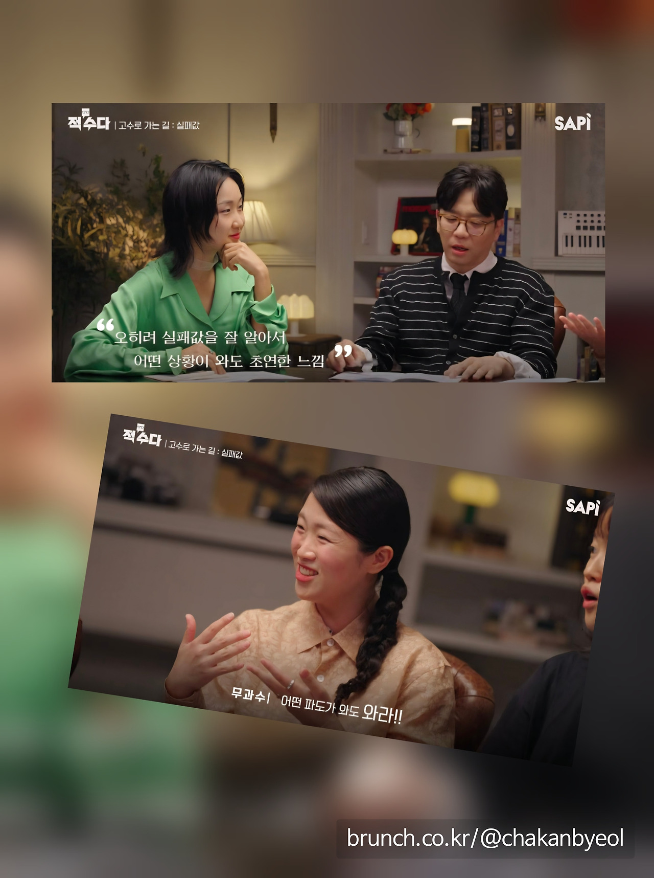 '고수'라는 키워드로 이야기하는 프로그램을 보다가 이슬아 작가가 말한 '실패값'이란 단어가 내 귀에 쏙 들어왔다. '태풍 치고 책 말리고 울고 이러는 것'도 실패값이라는 생각이 들었다. 멋지게 잘 살고 싶었는데 내가 컨트롤할 수 없는 인생의 변수들이 태풍처럼 파도처럼 자꾸 들이닥칠 때 '이제 난 망했어, 실패했어.'라고 생각되겠지만 대신 그 누구에게도 없는 '나만의 이야기'가 남는다. 그렇다면 '어떤 파도가 와도, 와라!' 하는 태도를 가진 사람이 고수가 아닐까? 어쩌면 내가 주인공인 삶에서 '고수'가 되는 게 인생일지 모른다.