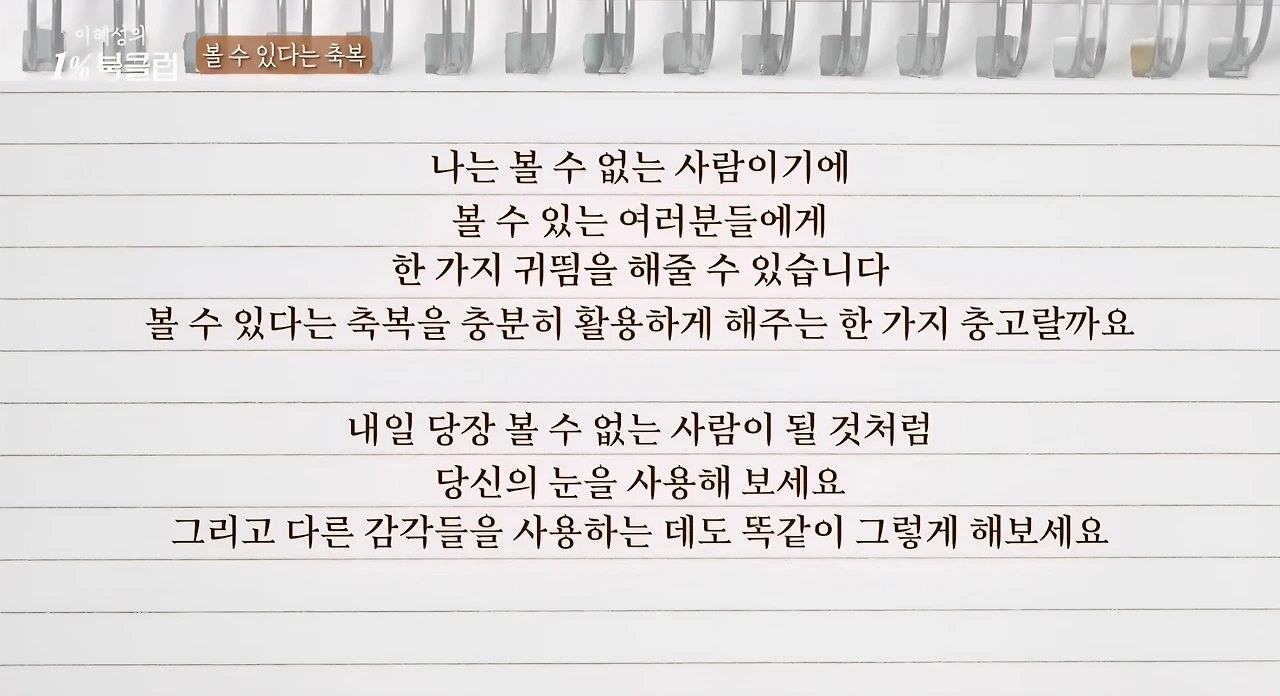 볼 수 있다는 것이 얼마나 큰 축복인지 시각장애인만이 깨닫습니다.