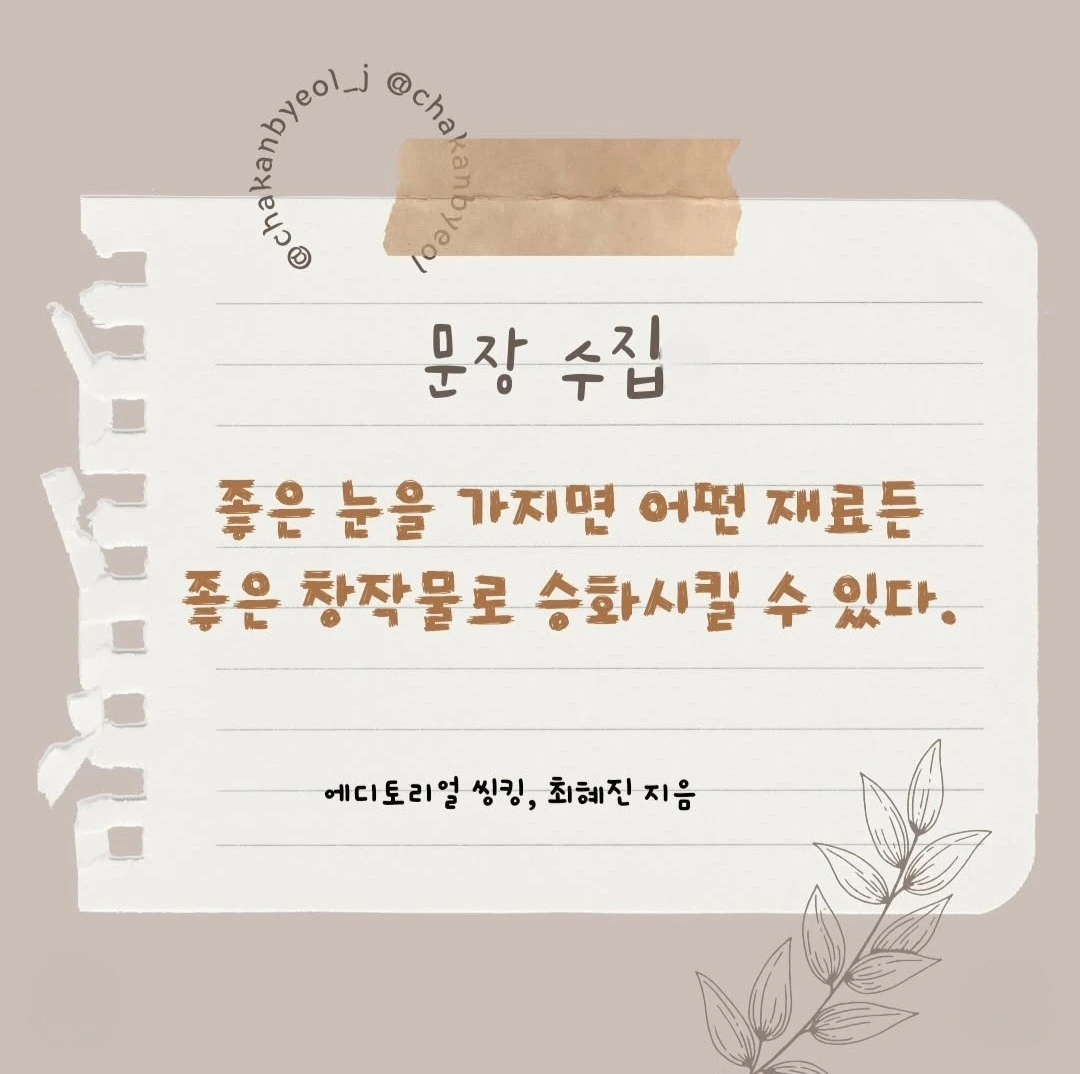 최혜진 작가의 『에디토리얼 씽킹』에 보면 '좋은 눈을 가지면 어떤 재료든 좋은 창작물로 승화시킬 수 있다.'라는 말이 나온다. 나도 좋은 재료를 '알아보는' 좋은 눈을 갖고 싶다.