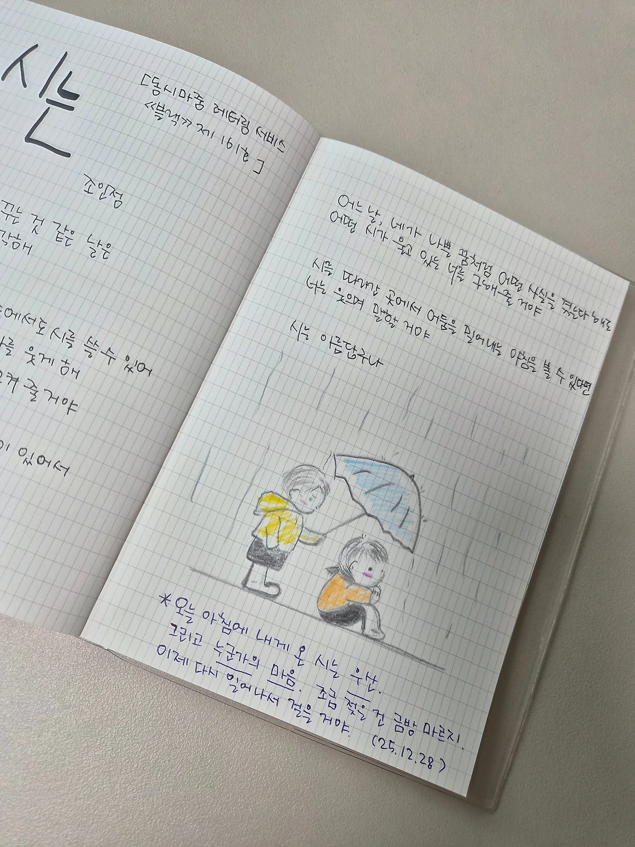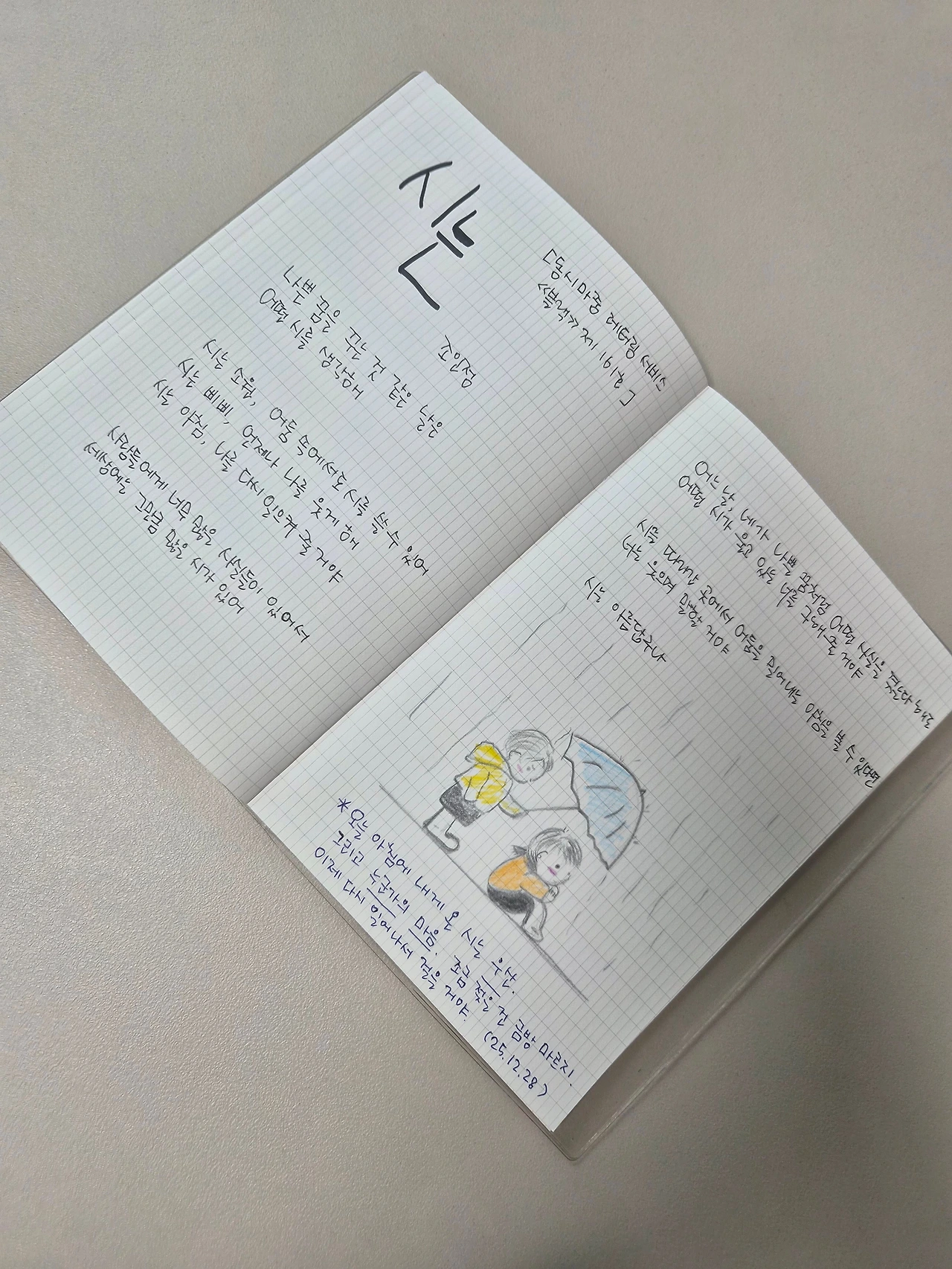 시가 아침처럼 나를 일으켜 세워줄 거라는 말, 시가 나쁜 꿈같은 사실에 울고 있는 나를 구해줄 거라는 말에 위로받았다. 시를 읽고 단상을 적으며 '나에게 시란 무엇일까?' 생각해 보았다. 오늘 내게 시는 우산이었다. 내가 흠뻑 젖기 전에 내게 온 누군가의 마음이었다. 나를 위해 우산을 들고 있는 사람들의 얼굴을 떠올리자 금방 마음이 괜찮아졌다. 그 사람들 중에는 "어떻게 첫 술에 배부르겠어.", "엄마, 그래도 괜찮아."라고 말해주는 남편과 아이가 있다. '잠깐 비 맞을 수도 있지, 조금 젖을 수도 있지. 금방 마르겠지. 어서 일어나서 다시 걸어가야지.' 하고 마음을 다잡았다. 시가 내게 준 위로 덕분이었다.