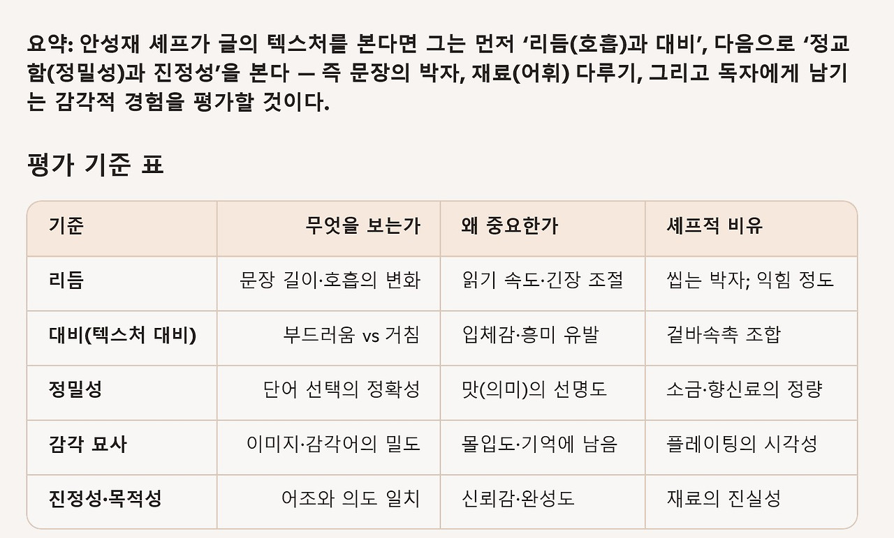 글도 누군가의 기억과 감정을 자극한다. 정성을 다해 만든 요리처럼 진심으로 쓴 글은 누군가의 기억 속에 남는 경험이 될 수 있다. 그렇다면 정성을 다해 만든, 기억과 감정을 자극하는 요리 같은 글이란 무엇일까? 그는 '텍스처'라는 말을 자주 한다. 식감이란 뜻이다. 문득 요리에서의 '텍스처'가 글에서는 무엇일까 라는 궁금증이 생겨서 AI에게 안성재 셰프가 글의 텍스처를 평가한다면 무엇을 볼지 물어보았다.