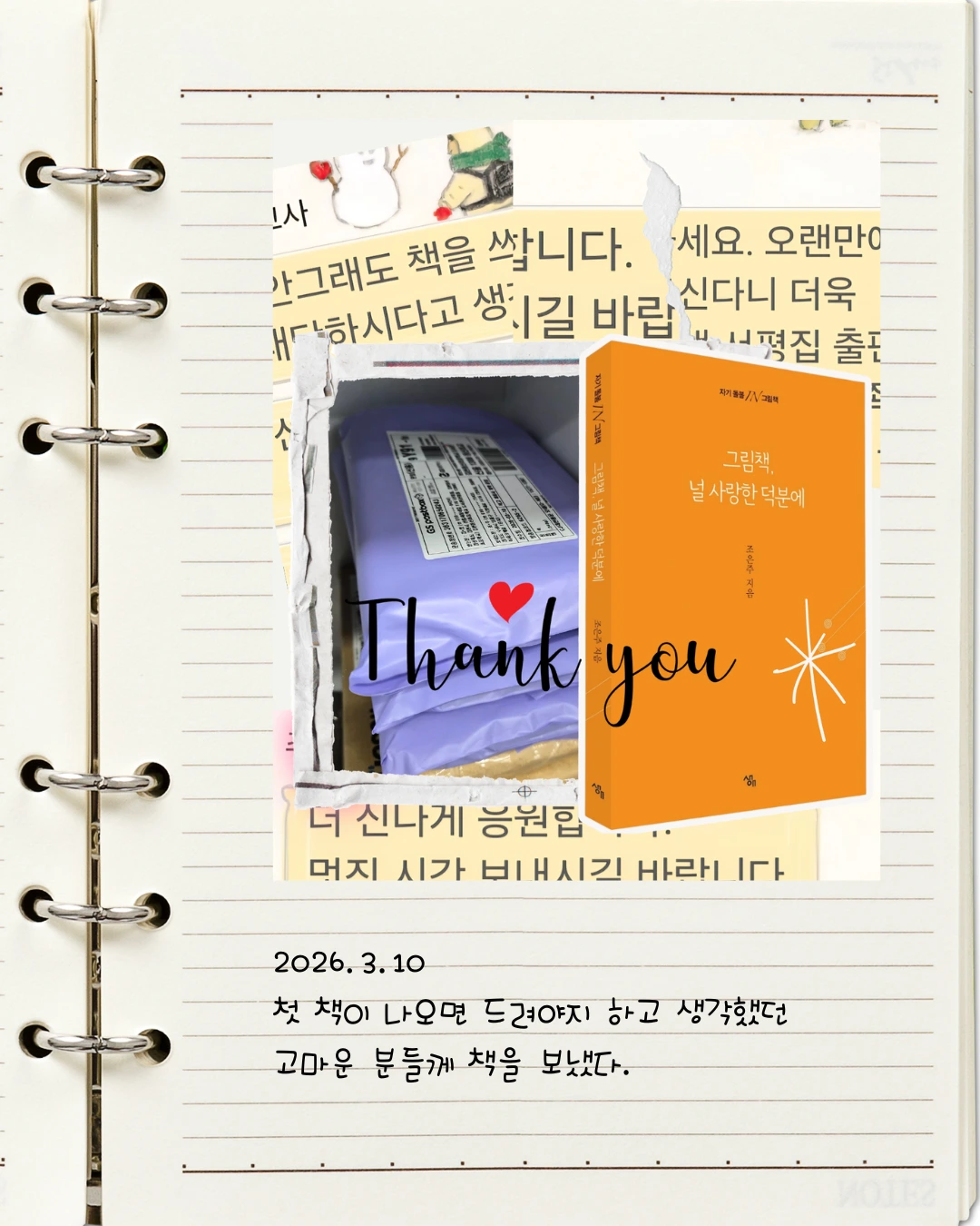 첫 책이 나오면 드려야지 하고 메모해 두었던 고마운 분들이 있다. "저는 여러분보다 20년 먼저 그림책을 만났을 뿐이에요."라고 말해주셨던 선생님 외에도 강사 경력이 별로 없는 나를 기꺼이 초청해 준 기관 담당자들, 자신의 첫 책이 나왔다며 보내주었던 사람들 등 내 첫 책을 꼭 선물해주고 싶은 사람들께 어제오늘 책을 보내드렸다.