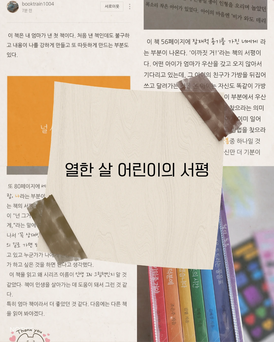 지난겨울방학에 글 쓰는 아이로 지냈으면 좋겠어서 '어린이 블로거'로 데뷔할 수 있게 블로그를 하나 개설해 주었다. 좋아하는 기차랑 책을 번갈아가면서 리뷰하라고 했는데 어제 내 첫 책의 리뷰를 써주었다. 아이가 내 책의 리뷰를 써준다고 했을 때 솔직히 별 기대를 안 했다. 우리는, 아이 4살 때부터 함께 그림책을 본 사이지만, 그림책은 0세~100세까지 보는 거라고 늘 얘기했지만, 나도 모르게 내 서평집이 아이가 이해하기엔 어려울 수 있다고 생각했나 보다. 그런데 아이는 내가 소개한 그림책들 중에서 자신에게 와닿은 그림책들을 잘 찾아서 리뷰를 썼다.
