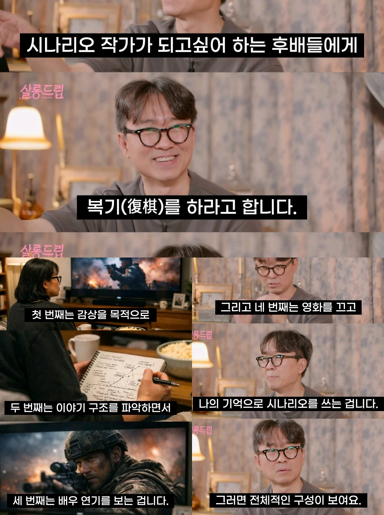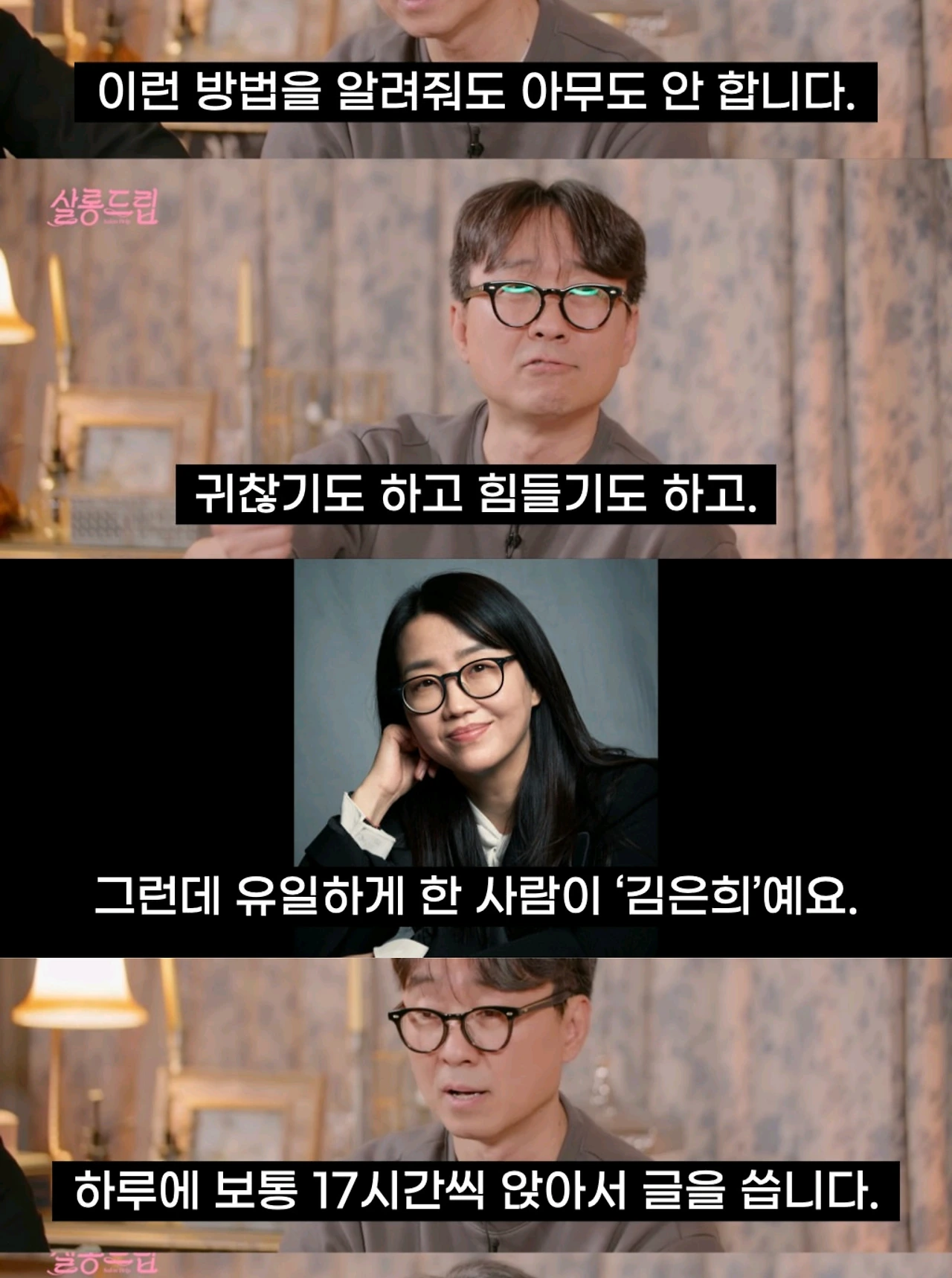 요즘 영화 '왕과 사는 남자'를 만든 장항준 감독이 인기다. 드디어 그는 천만 관객을 넘긴 거장 감독이 되었다. 그동안 그가 보여준 건강한 자기애와 긍정적인 마인드와 유쾌한 입담으로 그가 잘 되길 바라는 사람들이 많았다. 나 역시 그랬다. 김은희 작가의 남편이자 김은희 작가에게 시나리오 쓰는 법을 처음 알려준 사람이기도 한 그가 유튜브에 나와서 한 말이 인상 깊다. 시나리오 작가가 되고 싶어 하는 후배들에게 방법을 알려주었지만 방법을 알려줘도 아무도 하지 않았다는 말이 크게 와닿았다. 유일하게 그 방법대로 한 사람인 김은희 작가가 시나리오를 잘 쓰게 된 게 당연하다는 생각이 들었다. 하루에 보통 17시간씩 앉아서 글을 쓴다는 김은희 작가 이야기에 그 정도로 열심히 하는 사람이니 유명한 작가가 될 수 있었구나 수긍할 수 있었다.