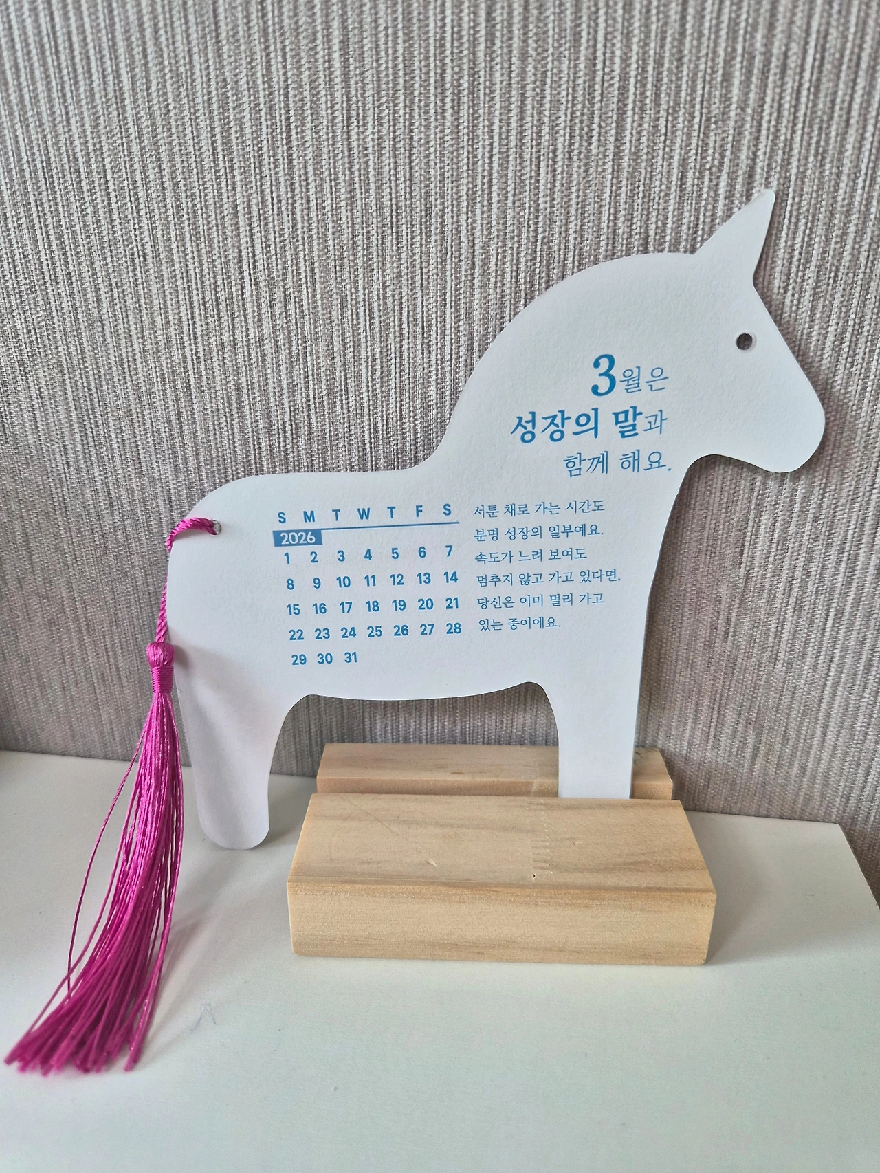 3월의 말을 보니 핑크 말이다. 뒷장에는 "성장의 말과 함께 해요"라고 쓰여있다. 서툰 채로 가는 시간도 분명 성장의 일부라는 말도 멈추지 않고 가고 있다면, 당신은 이미 멀리 가는 중이라는 말도 모두 내 마음속으로 걸어 들어왔다.