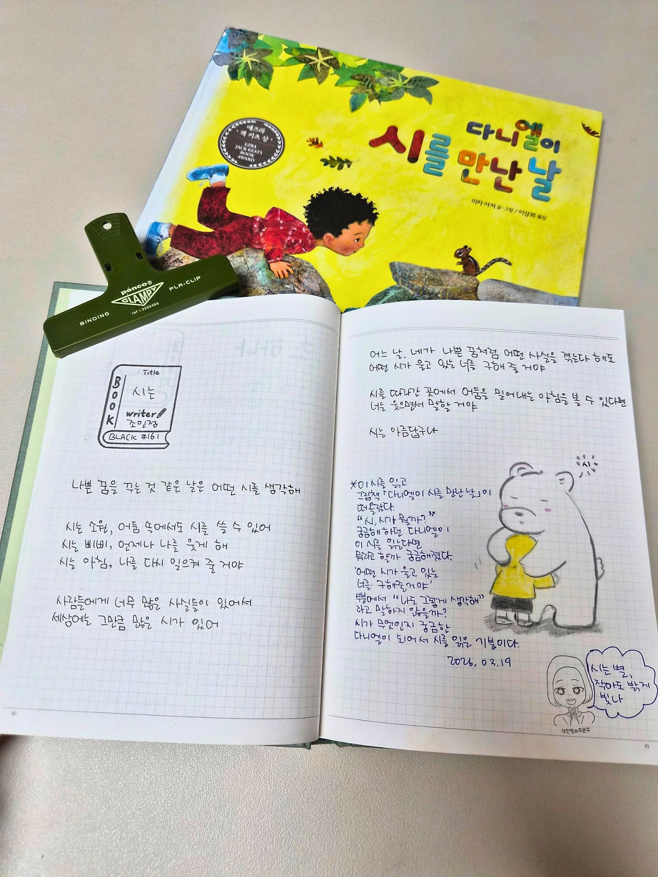 조인정 시인의 『시는』을 읽다가 그림책 『다니엘이 시를 만난 날』 이 생각났다. 시가 무엇인지 궁금해하던 다니엘이 이 시를 읽는다면 뭐라고 할까? "어떤 시가 울고 있는 너를 구해줄 거야" 부분에서 "나도 그렇게 생각해"라고 말하지 않을까? 요즘 시가, 동시가 궁금한 나는 다니엘이 되어서 시를 읽은 기분이다.