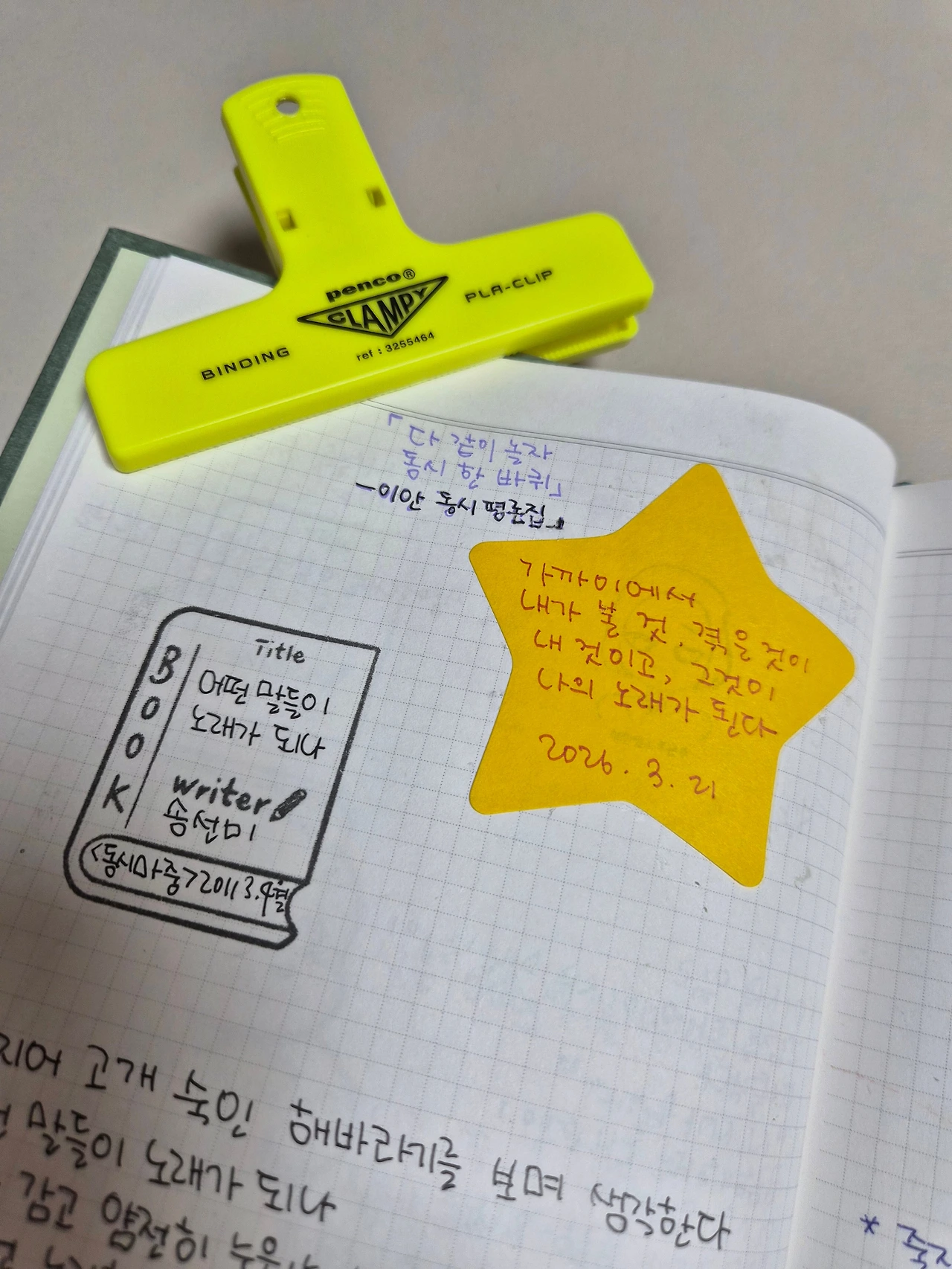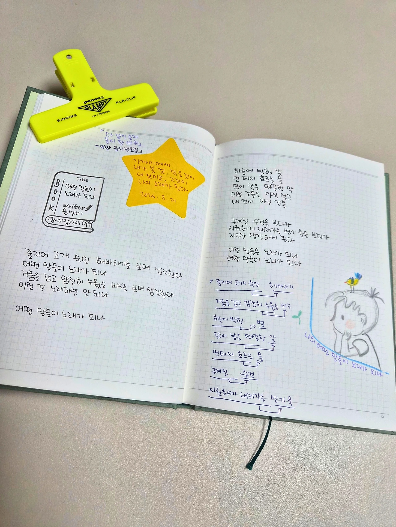글이라는 것이 원래 작가의 경험에서 나오기 마련인데 동시는 더 자세히 관찰하고 구체적인 한정 속에 써야 하는 건가 보다. 문학 장르 중에서 시가 가장 어려운 거라던데 시가 먼저 되고 그다음에 동시가 되는 거라면 동시는 정말 어려운 건가 보다. 이 어려운 걸 배우기로 결정한 나라니. 칭찬해. 1부터 시작한다는 마음으로 해보자. 어떤 말들이 노래가 되나. 나의 어떤 말들이 동시가 되려나.