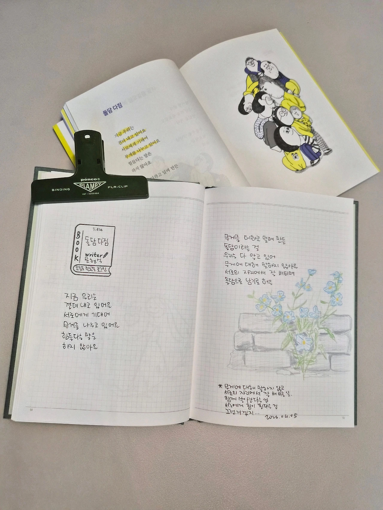 돌담이 나오는 일러스트를 찾다 보니 돌담 틈새로 꽃이 피어있는 그림들이 많았다. 그래서 동시 필사 옆에 따라 그려 넣었다. 서로에게 기대어 버티고 있는 돌담들 사이에 핀 꽃들처럼 삶도 그렇다. 힘든 일 사이에 간간히 기쁘고 즐겁고 행복한 일들이 있다.