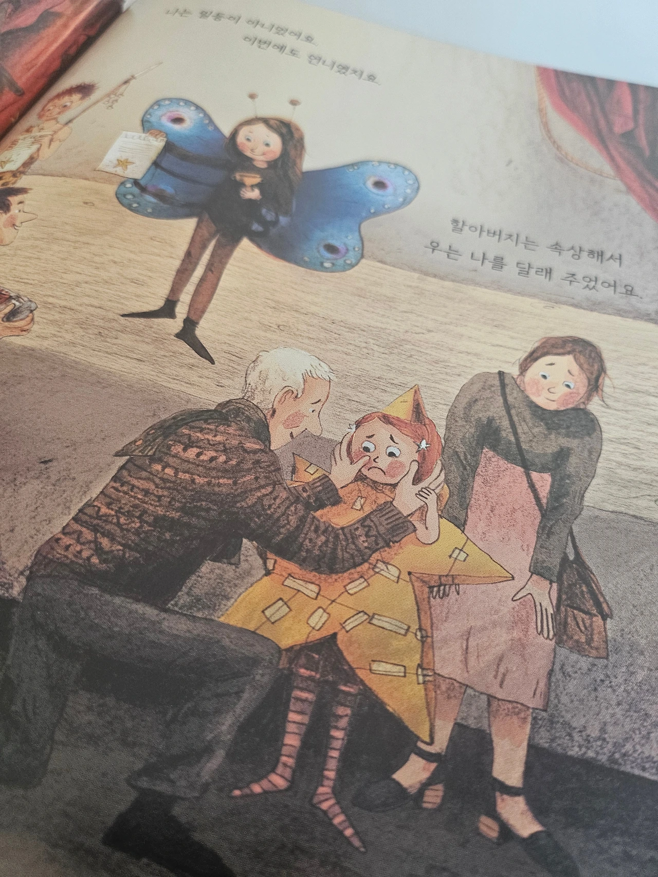 손녀의 속상한 마음을 알아챈 할아버지는 아이에게 멋진 이야기를 들려준다. 아무것도 없던 어두운 세상의 시작은 별 하나, 별 둘, 별 셋...이었다는 흥미로운 이야기다. 그렇게 깜깜한 우주에 반짝이는 별들이 가득하게 되고 여러 행성과 달, 산, 바다, 식물, 동물이 생겨나고 마지막으로 사람들이 태어났다는 신비로운 이야기다. 보잘것없어 보이는 돌멩이도 비를 맞으면 반짝반짝 빛나는 건 돌멩이 역시 별에서 생겨났기 때문이라는 말에서는 나도 감동받았다. 그러니 아이야, 별에서 온 너는 이미 너만의 빛으로 빛나고 있어라는 할아버지의 말은 나에게도 울림이 되었다. 그림책 속 할아버지처럼 현실에서도 이런 얘기를 해주는 어른이 아이들에게 한 명씩 꼭 있었으면 좋겠다는 생각이 들었다.