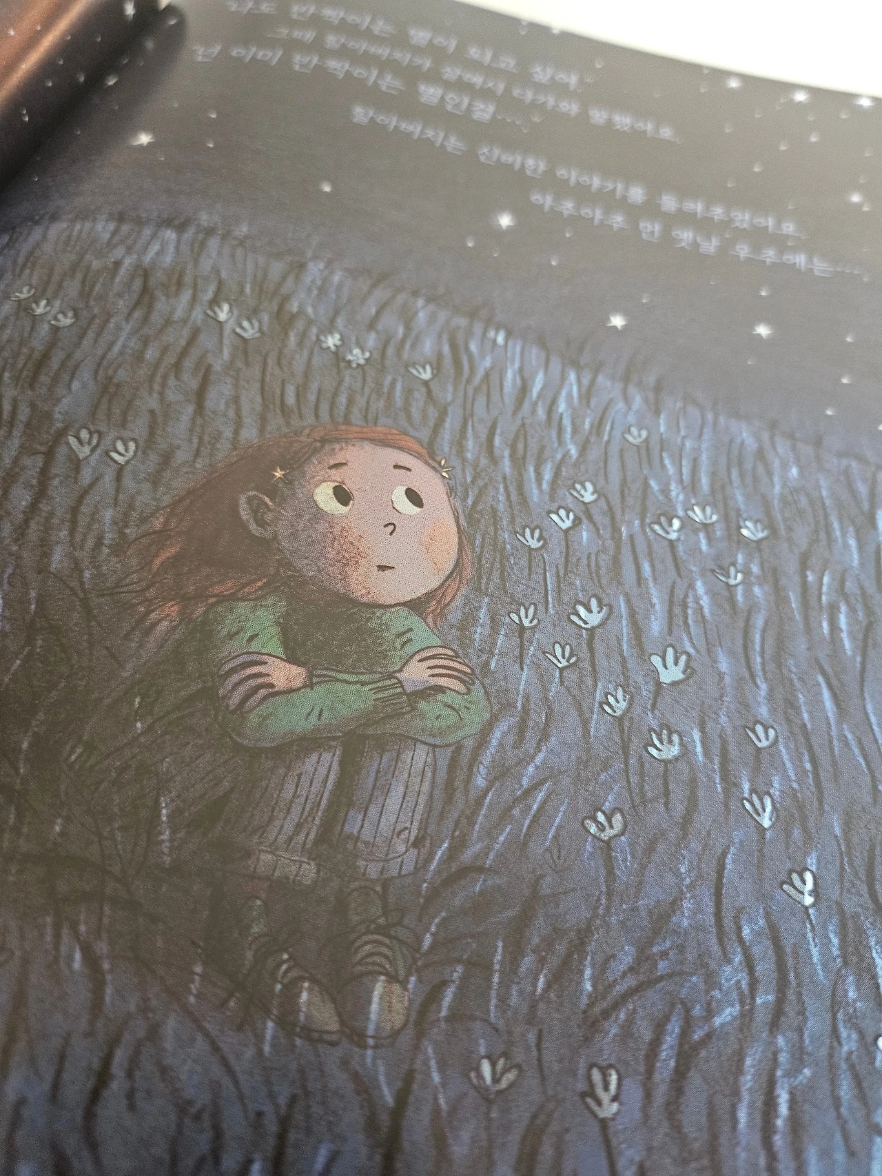 앞면지에 가득한 크고 작은 별들을 보며 매일 밤 이런 별들을 보고 살면 어떤 기분일까 라는 생각이 들었는데 페이지를 넘기니 한 아이가 창밖의 별을 보고 있다. 어릴 때부터 저렇게 많은 별을 밤마다 보았으면 반짝반짝 빛나는 별이 되고 싶은 건 당연한 건지도 모르겠다. 쏟아지는 별을 보며 자란 아이는 분명 다를 것이다.