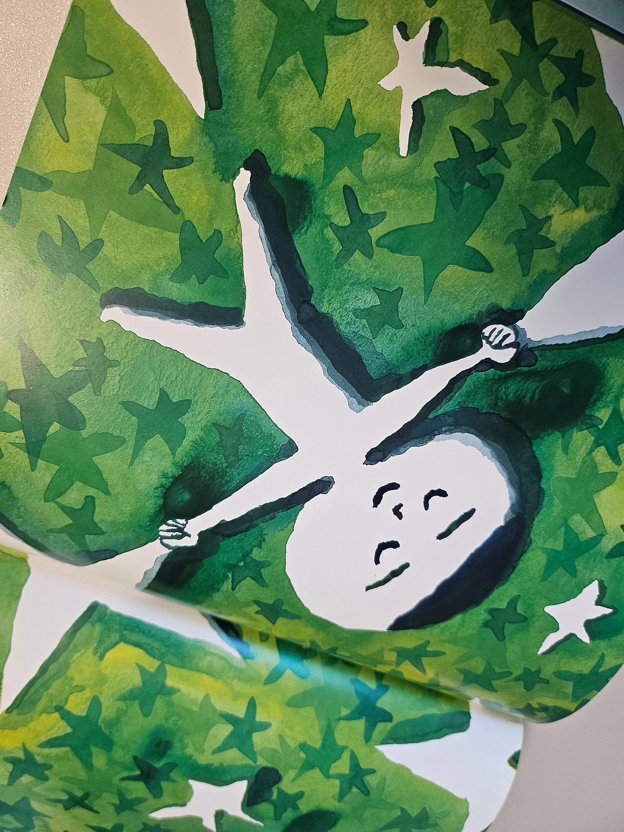 두 팔 크게 벌리고 누운 풀밭 초록별들처럼 아이도 두 팔 벌려 눕는다. 그랬더니 초록별들과 손 잡고 별자리가 되었다. 아이의 편안한 마음이 내게도 전달된다. 이 장면을 보며 나도 아이처럼 초록별밭에 누워 '와, 기분 좋아'라고 말하고 졌다. 독자의 그런 마음을 예상한 작가는 다음 페이지에 친구들이 다가와서 아이 곁에 눕게 한다. 그렇게 초록별이 하나씩 늘어가고 별의 아이들은 하나의 별자리가 된다.