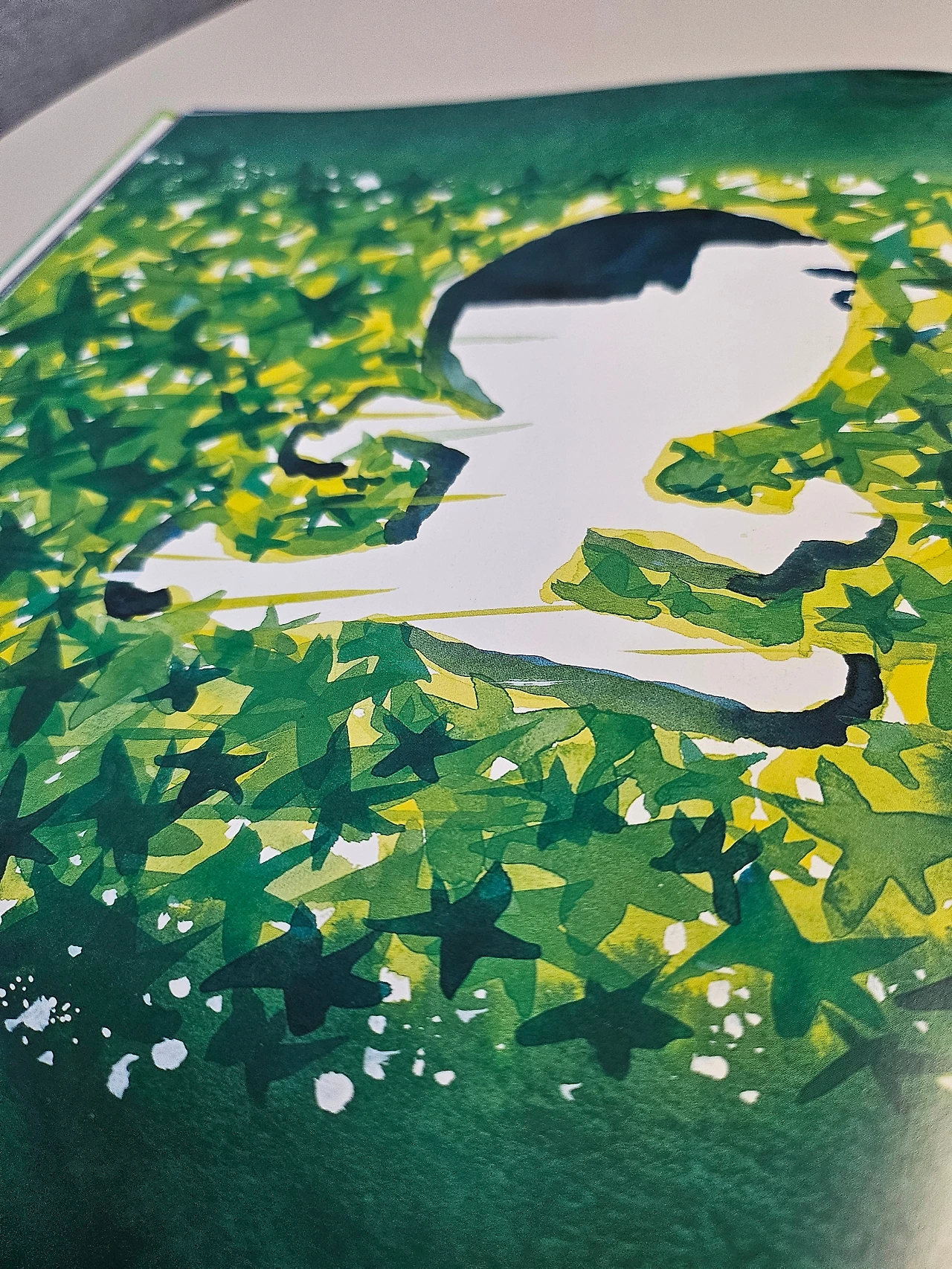 아이의 초록별 찾기는 계속된다. 하나의 발견이 신나는 놀이로 확장되었다. 심심했던 아이는 이제 없다. 우산 구멍으로 나온 햇살은 물웅덩이에 뜬 별이 되고 나뭇잎별들이 가득 모여 초록별 은하수를 만든다. 이제 발견은 상상이 되고 꿈이 된다. 아이는 초록별 은하수를 달려 별똥별을 잡을 거란다.