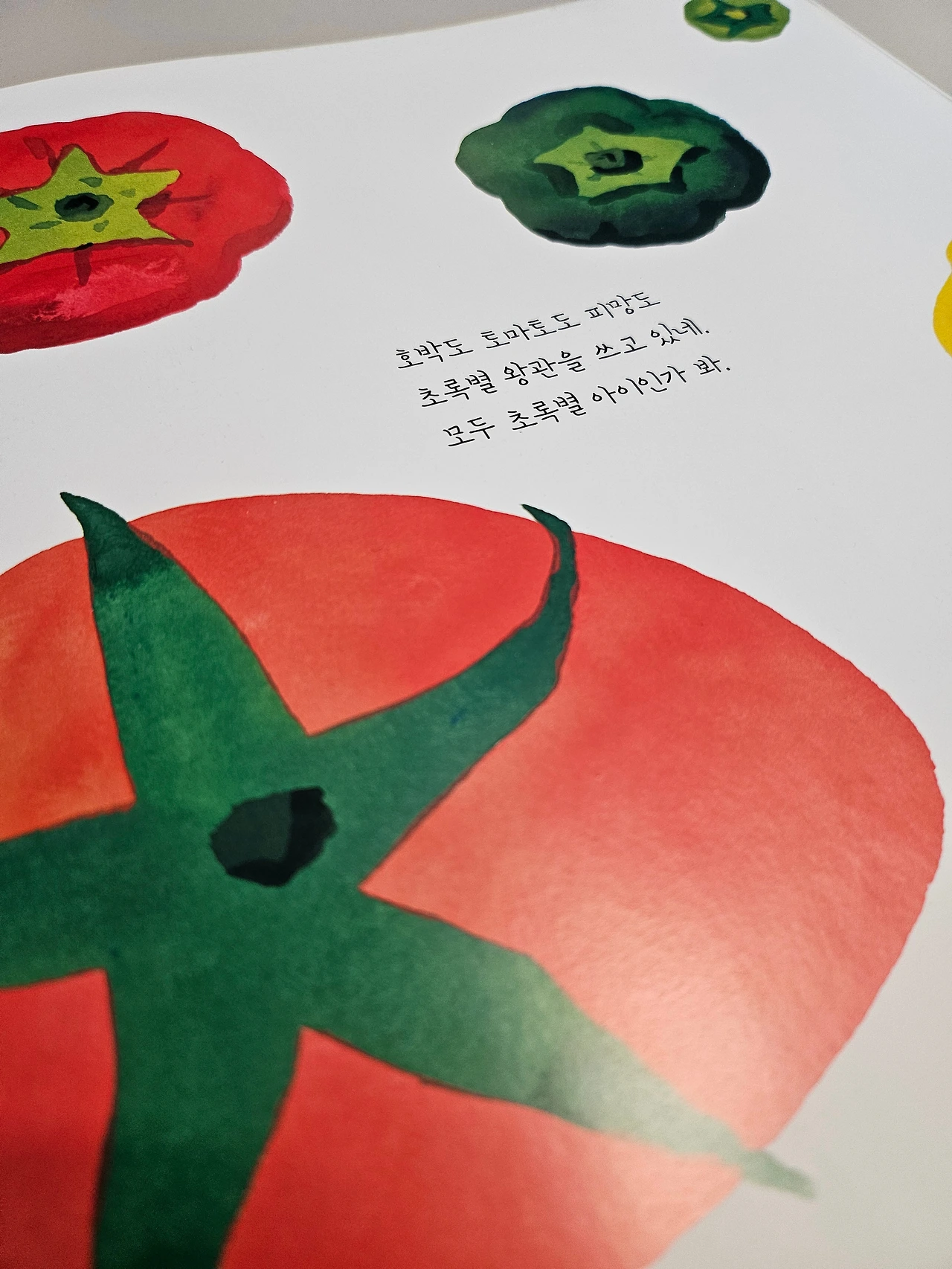 초록별이 또 있는지 궁금해진 아이는 더 찾아본다. 텃밭으로 간 아이는 호박도 토마토도 피망도 초록별 왕관을 쓰고 있는 걸 발견한다. 모두 초록별 아이고 초록별이 꽃을 안고 있다고 표현한다. 초록별을 찾고 알아보는 마음이 기특하고 예쁘다.