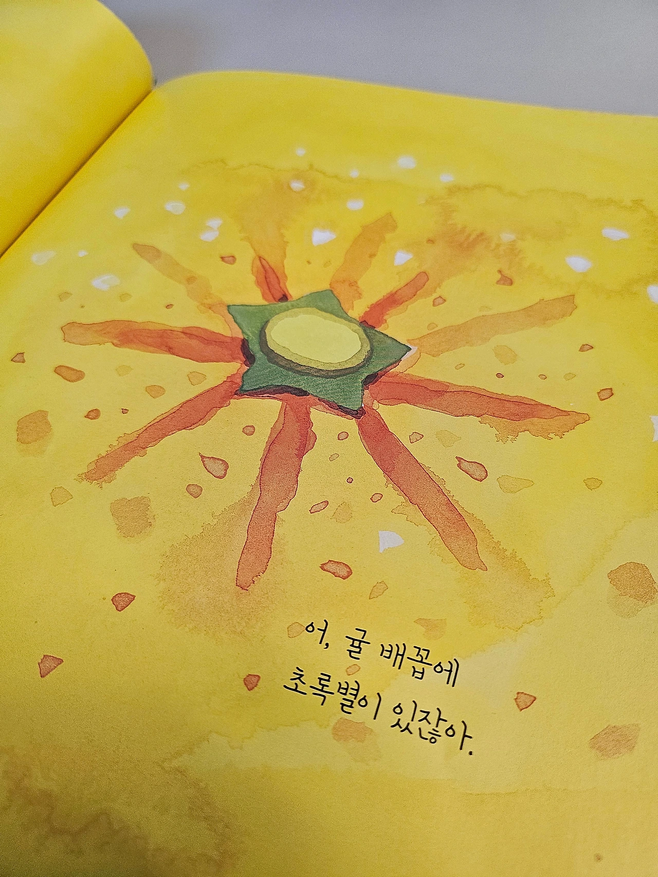 호기심이 많은 아이는 사실 심심할 틈이 없다. 그림책 속 아이도 그렇다. 식탁 한가운데 있는 노란 귤 하나를 보고 달님처럼 둥글다고 느낀다. 을 보고 달님을 떠올릴 줄 아는 이 창의적인 어린이는 곧 '놀라운 발견'을 한다. 귤 배꼽에서 초록별을 발견다니! 내 아이였다면 감탄해서 정말 멋진 발견이라고 말해주며 한참을 박수 쳐주었을 것이다. 다른 사람들이 보지 못하는 것을 발견하는 건 큰 기쁨인데 이 아이는 일상을 호기심 어린 눈으로 관찰하고 새로운 걸 발견할 줄 아는 멋진 어린이다.