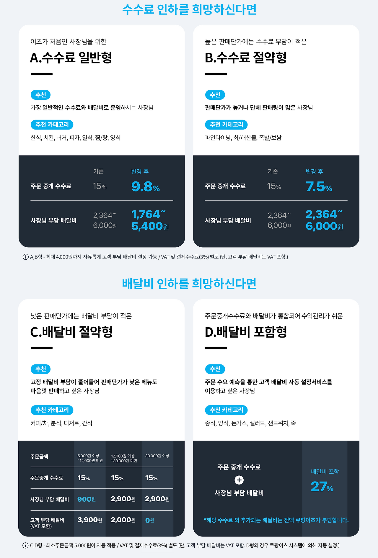 양사는 결국 비용 부담을 이기지 못하고 올해 들어 단건배달 서비스인 '배민1'과 쿠팡이츠의 가격을 사실상 올렸다. 본래 둘다 단건배달에 대한 강력한 프로모션을 실시하는 과정에서 자영업자들에 돌아가는 부담을 최대한 줄이고 있었다. 이에 식당 점주들은 주문 중개수수료 1천원, 배달비를 최대 5천원만 내면 됐지만 양사가 가격 체계를 바꾸면서 부담이 늘게 됐다.