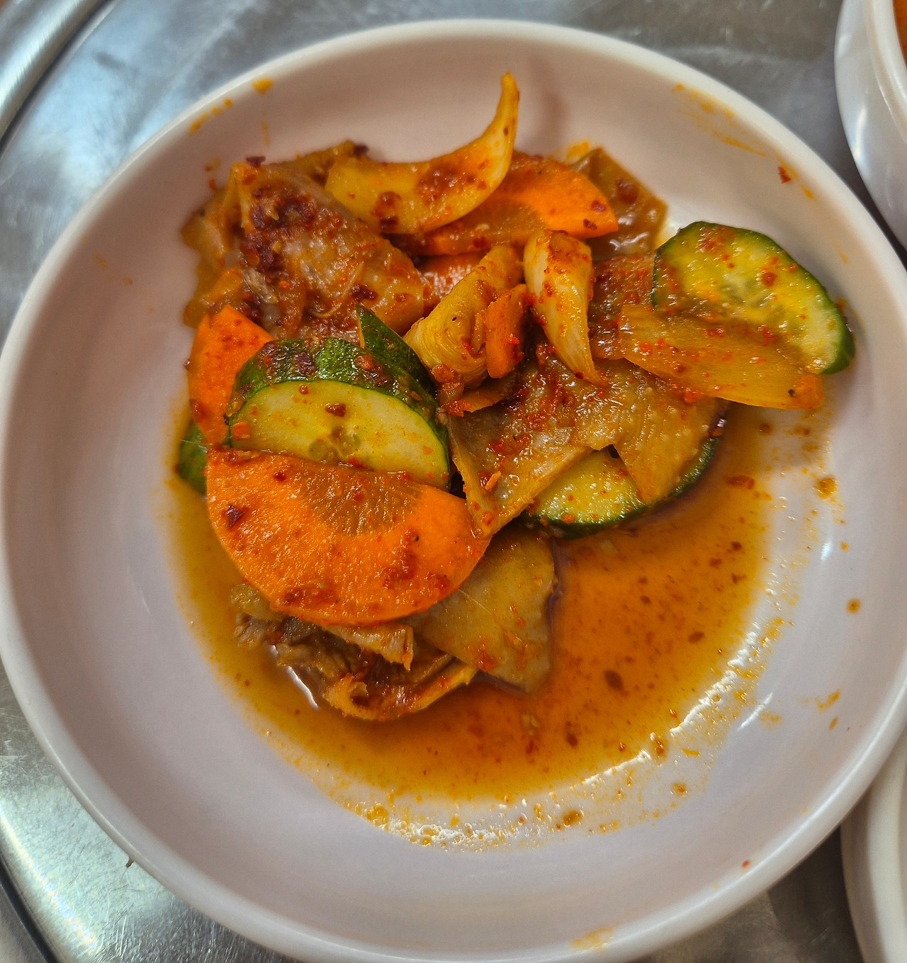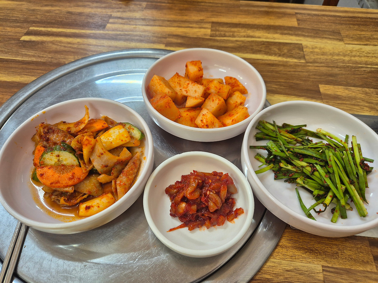 먼저 반찬이 나온다. 깍두기와 부추무침, 오징어젓갈이 나온다. 그리고 반찬 중 가장 눈에 띄는 '닭껍질무침'도 반긴다. 오이, 당근, 양파 등 갖은 야채를 쫄깃한 닭껍질과 함께 매콤달콤한 고춧가루 양념에 버무렸다.