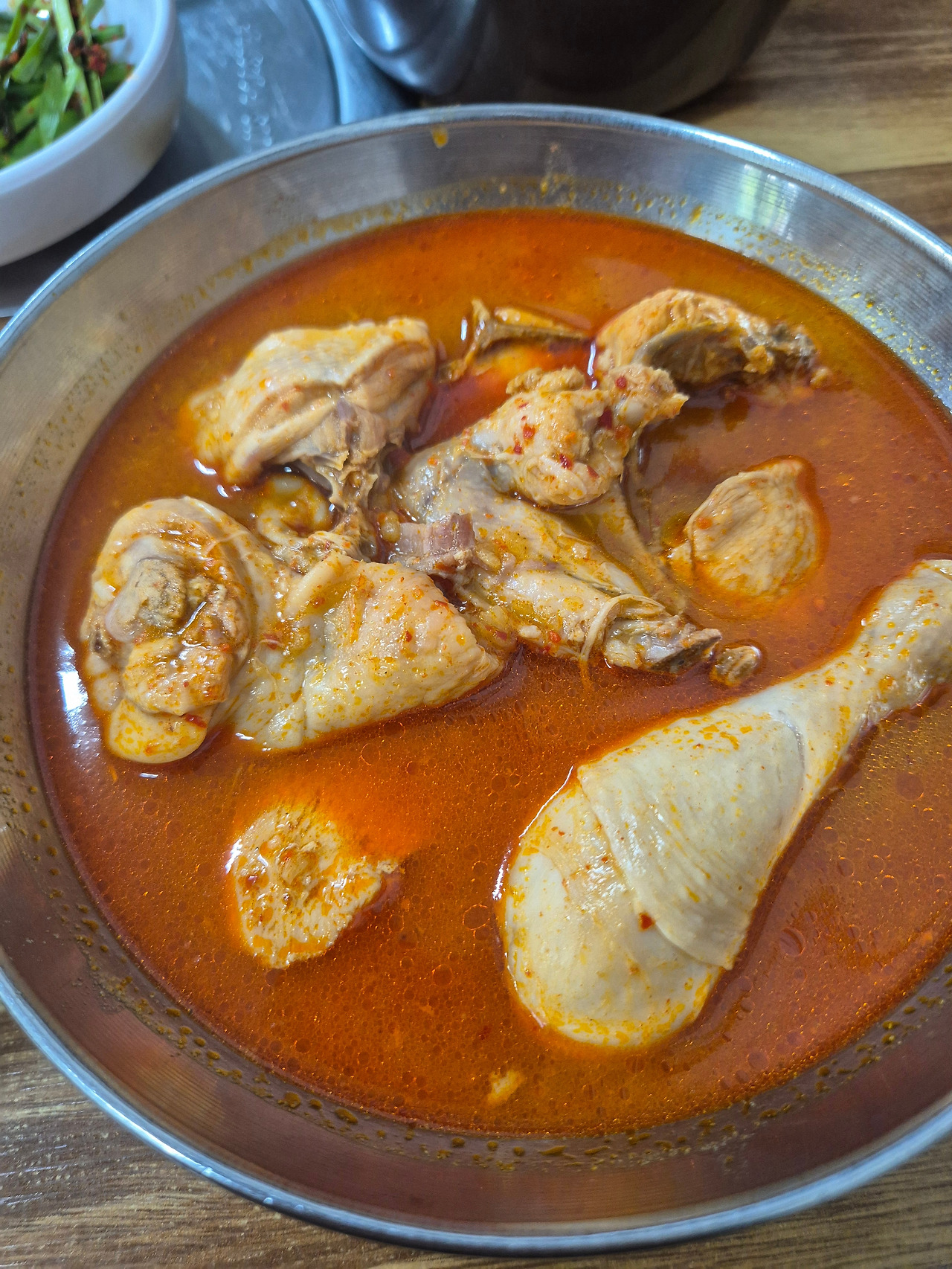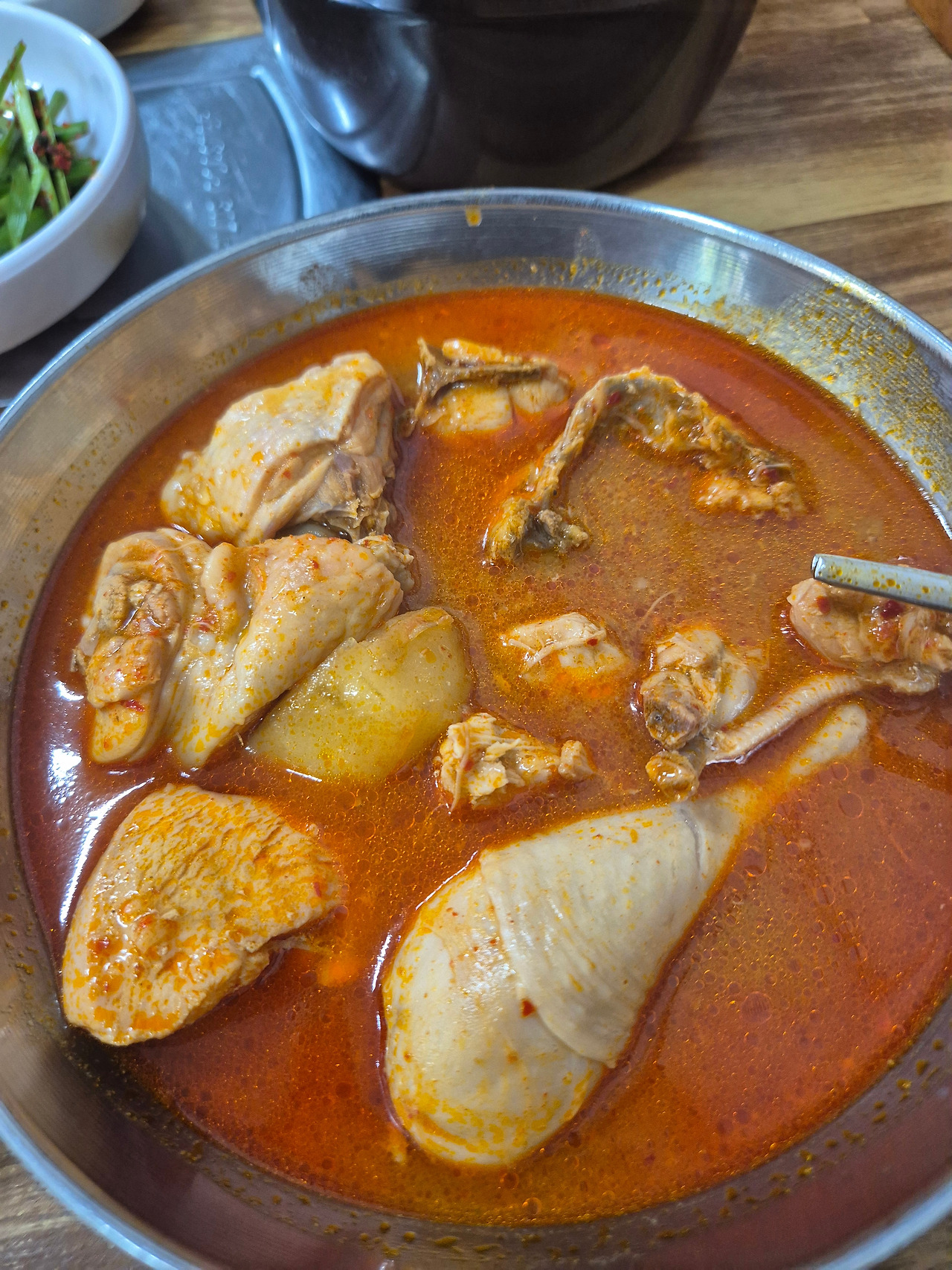 그리고 조금 기다리자 나온 닭도리탕. 스뎅 그릇 안에서 빨간 국물에 적셔져 있는 닭고기들에 벌써부터 침이 고인다. 나는 닭도리백반 '특'을 시켰는데 반마리 정도의 닭에 감자와 양파, 당근 등이 조금씩 들어 있다. 마치 국을 연상케 할 정도로 국물 양이 많다는 점도 특기할 만한 점.