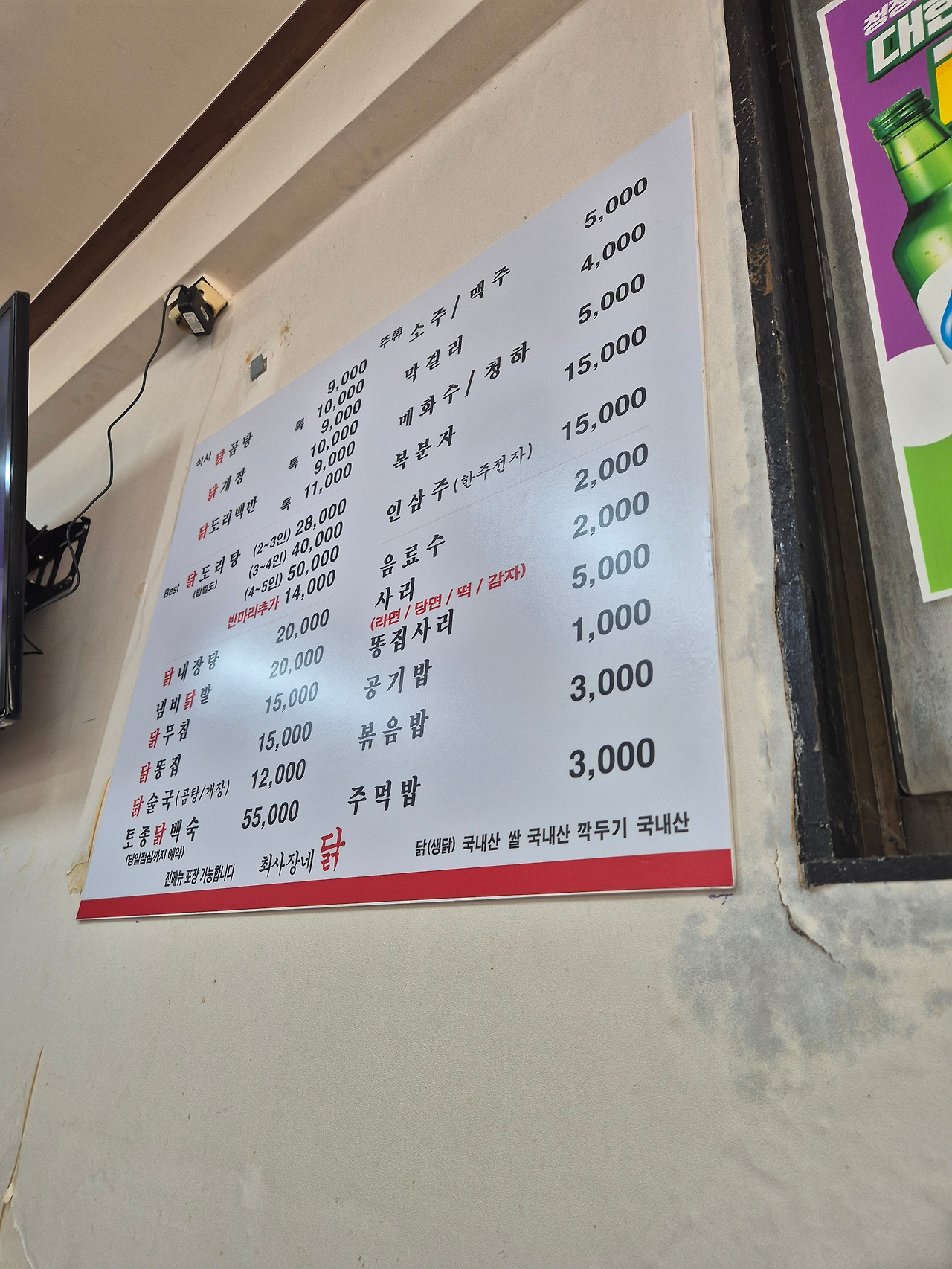 식사 메뉴로 닭곰탕과 닭개장, 그리고 닭도리백반을 판다. 자연스럽게 닭도리백반과 소주 한 병을 시킨다. 이날은 토요일 오후 1시 좀 넘어 살짝 애매한 시간에 와서 생각보다 손님이 많지는 않았고, 나처럼 혼자 와서 식사하고 있는 손님들도 좀 있었다. 혼밥하는 손님들의 대부분은 닭도리백반을 먹고 있었다. 반찬 몇 가지와 함께, 혼자 먹을 만큼의 닭도리탕이 스뎅 그릇에 적당히 담겨 나온다. 그야말로 한 그릇 뚝딱 하기 좋은 구성.