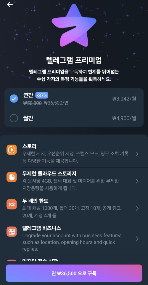 이처럼 카카오톡에 하도 여러 기능들이 생기다 보니 이제는 이런 생각도 듭니다. 텔레그램처럼 무료 이용자들에게는 메신저 위주의 심플한 기능 위주로 제공하고 각종 부가서비스는 유료 상품 구독 패키지로 묶는 게 어떨까 하는 거죠.