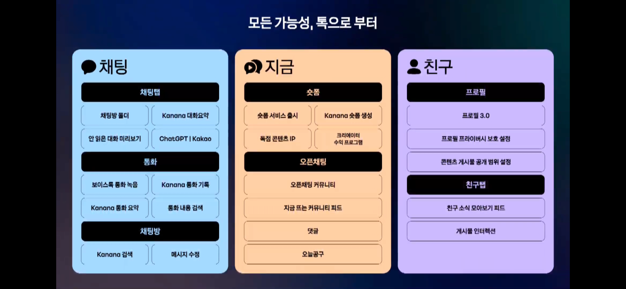 카카오는 이날 카카오톡에 어떻게 AI가 결합돼, 카톡 이용자들이 이를 편리하게 쓸 수 있는지 설명하는 데 집중했습니다. 특히 챗GPT에 카카오톡의 여러 서비스들이 유기적으로 결합돼 이용자들이 다양한 편익을 누릴 수 있다고 설명한 점이 가장 기억에 남습니다. 또 오픈채팅방 탭을 '지금' 탭으로 개편, 오픈채팅방에 숏폼(짧은 동영상)을 추가하며 숏폼에 공을 들이는 모습을 보였습니다. 친구들의 일상을 더욱 쉽게 알 수 있도록 하는 '친구' 탭의 개편도 발표했습니다. 전체적으로 어떻게 하면 이용자들을 최대한 오랫동안 카카오톡 내 붙잡을 수 있을까 고민한 흔적이 역력했죠.
