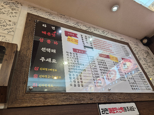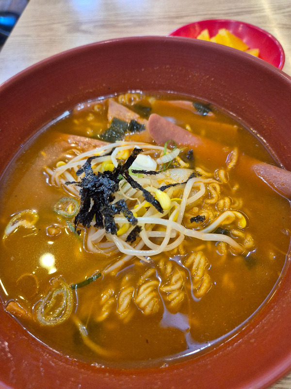 다만 이날은 점심이라 배가 별로 고프지 않아 빨부대에 찬밥만 하나 시켰다. 이제 맵기를 정해야 했는데... 평소라면 '가장 매운맛'으로 시켰겠지만 이번에는 그냥 '중간 매운맛'으로 시켰다. 중간 매운맛이라고 해도 신라면의 3배 정도 맵기다(가장 매운맛은 5-6배 정도라고 한다). 평소라면 후폭풍을 감수하고 가장 매운맛을 먹었겠지만 오늘은 그렇게까지 해서 매운 것을 먹고 싶지는 않았다. 그냥 간만에 나름대로 추억의 가게에 방문한 데 의의를 두기로.