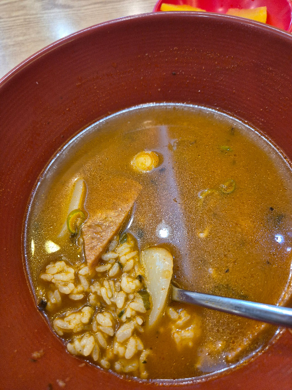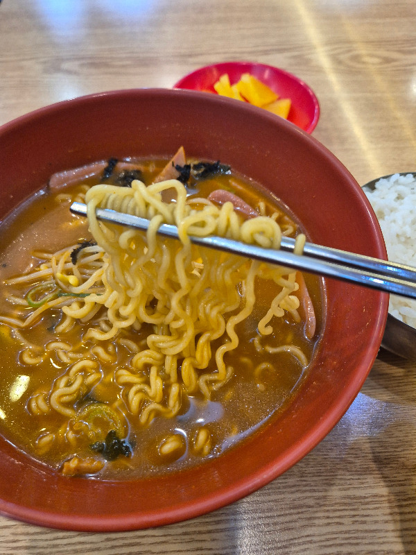 중간 매운맛은 확실히 덜 맵다. 요즘 워낙 틈새라면 말고도(틈새라면만큼은 아니지만) 매운 라면이 많이 시판되고 있는데 체감상 이들보다 살짝 더 매운 정도인 듯. 매운 걸 좋아한다면 그냥저냥 물을 마시며 먹을 수 있을 정도다. 라면과 소시지를 건져 먹다가 반쯤 남았을 정도에 찬밥을 말아준다. 밥을 말았을 때는 숟가락으로 라면 국물이 흥건한 밥알과 남은 면 몇 가닥을 한 번에 건져먹는 것도 별미다. 역시 라면에는 찬밥이 환상의 궁합이라는 생각을 한다.