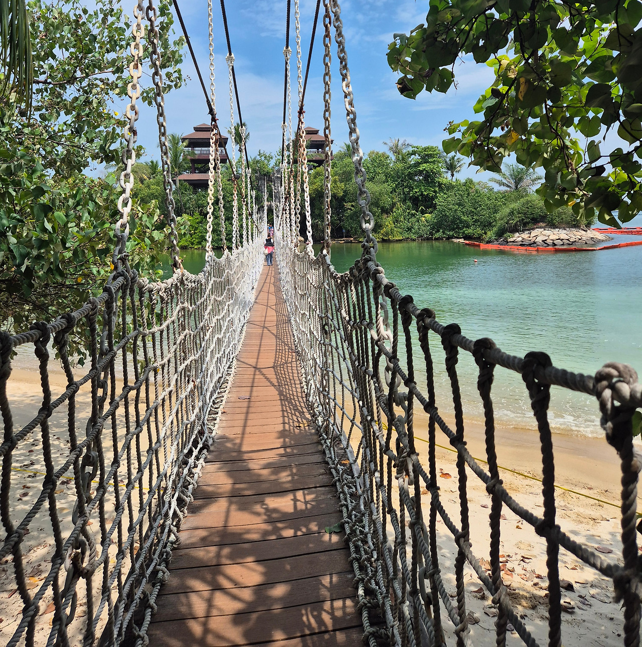 마찬가지로 싱가포르 창이공항을 통해 싱가포르로 입국한다. 공항과 바로 연결된 싱가포르 MRT(지하철)을 타고 타나메라(Tanah Merah) 역에서 EWL(동서선·초록색) 본선으로 한 차례 환승한 다음, 시내 구간을 지나 우트램 파크(Outram Park) 역에서 NEL(동북선·보라색) 선으로 갈아타고 종점인 하버프런트(Harborfront) 역까지 간다. 역에서 센토사섬까지 가는 해상 케이블카 터미널이 바로 연결돼 있어, 이걸 타면 센토사섬에 도착할 수 있다. 센토사섬 내에서는 도보로 이동하거나 무료 셔틀버스(코끼리열차와 비슷하다)를 타면 된다. 팔라완 비치에 도착하면 작은 섬에 다리가 연결된 것을 볼 수 있는데 바로 이 섬에 '아시아 최남단'을 나타내는 표지판이 있다. 창이공항에서 바로 가려면 몇 차례 환승해야 하지만, 시내 쪽에서는 이보다 금방 갈 수 있다.