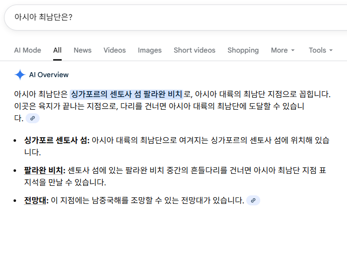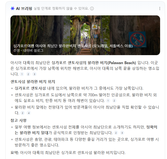 이러한 오류는 네이버의 AI 검색 서비스인 'AI 브리핑'에서도 나타났다. 아시아 최남단에 대해 검색하자 AI 브리핑은 정확히 "아시아 대륙의 최남단은 싱가포르 센토사섬의 팔라완 비치"라고 명시한다. 그러면서 출처로 여러 네이버 블로그 글들을 내세운다. 원 출처 자체가 잘못된 정보를 담고 있다 보니 AI 검색에서도 잘못된 정보가 표출되는 상황이다. 다만 이 같은 오류는 구글의 AI 검색인 'AI 오버뷰'에서도 나타나는데(한국어 기준. 영어로 물어보면 제대로 된 답이 나온다) 마찬가지로 한글로 된 출처들이 팔라완 비치를 아시아 최남단이라고 잘못 언급한 경우가 많기 때문으로 추정된다. 그렇다고 하더라도 똑똑한 AI라면 이런 건 걸러냈어야 하는데 말이다.